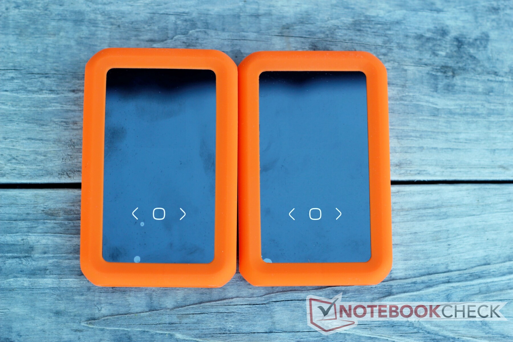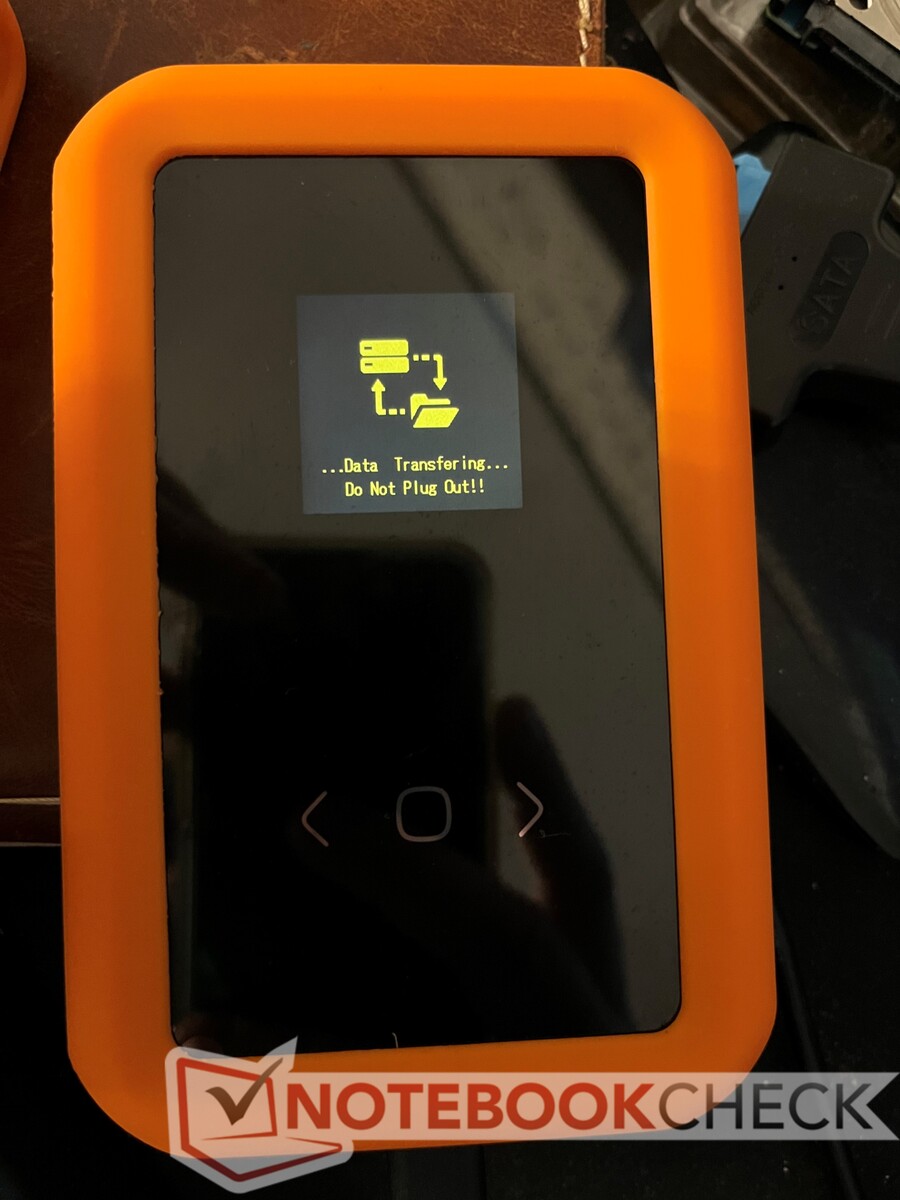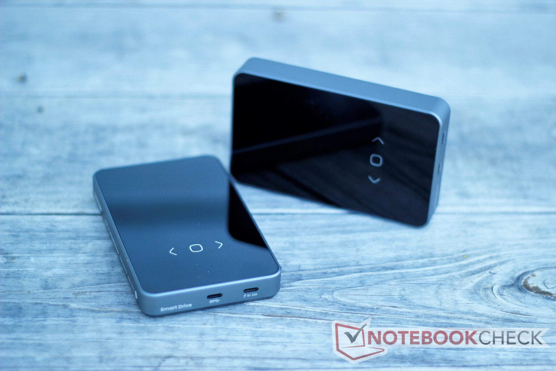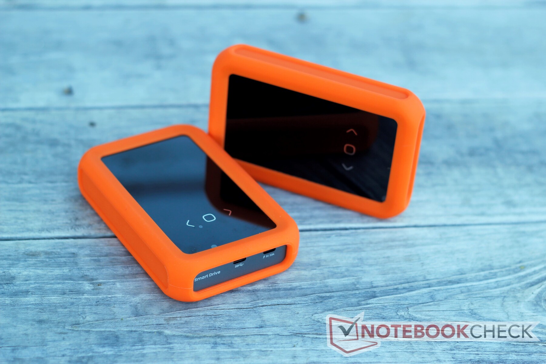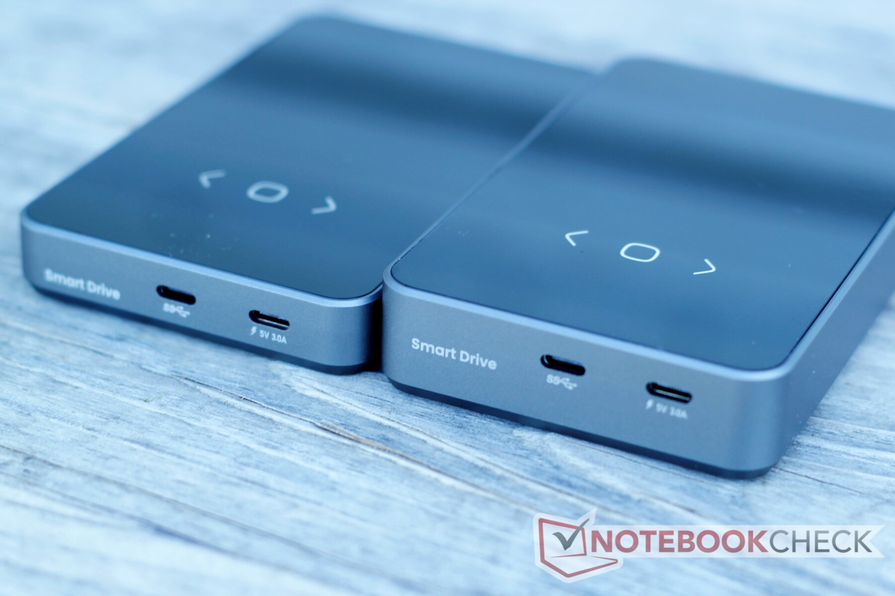 An der Vorderseite befinden sich zwei USB-C-Anschlüsse. Einer wird für Datenübertragungen und die Stromversorgung des Laufwerks verwendet, während der andere als 15-Watt-Hilfsstromversorgung dient. Da Smartphones (und einige andere elektronische Geräte) möglicherweise nicht genug Saft liefern, um das Laufwerk mit Strom zu versorgen, wenn es an das Gehäuse angeschlossen ist, liefert dieser Anschluss bis zu 15 Watt zusätzlich, um sicherzustellen, dass Übertragungen möglich und stabil sind. Auf der Rückseite des Gehäuses befindet sich eine mechanische Taste, der für die Navigation durch die Bildschirmmenüs verwendet wird.