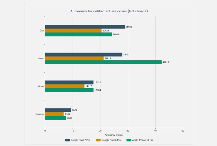 Denn beim Video-Streaming hält das neue Modell 17:32 Stunden durch, drei Stunden länger als das Pixel 6 Pro und in etwa gleich lange wie das Apple iPhone 14 Pro (ca. 1.299 Euro auf Amazon). Beim Musik-Streaming und Telefonieren hält das neue Flaggschiff gleich sieben bis achteinhalb Stunden länger als sein Vorgänger, wobei das iPhone 14 Pro bei einigen Anwendungen deutlich länger durchhält, etwa beim Musik-Streaming, bei der Nutzung von Social-Media-Apps oder auch beim Einsatz des GPS-Moduls.