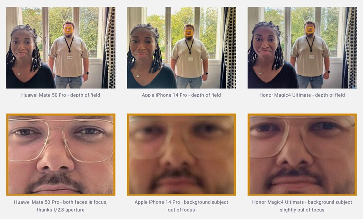Der unten eingebettete Vergleich macht die Vorzüge der variablen Blende deutlich – so kann die Tiefenschärfe auf Knopfdruck vergrößert werden. Theoretisch ließe sich dasselbe Resultat durch die Aufnahme und Kombination mehrerer Fotos mit unterschiedlichem Fokus erzielen, allerdings unterstützt kaum ein Smartphone Focus Stacking. Die Kamera-App des Mate 50 Pro blendet automatisch auf f/2 oder f/2.8 ab, wenn eine größere Tiefenschärfe bei Gruppen-Porträts notwendig ist.