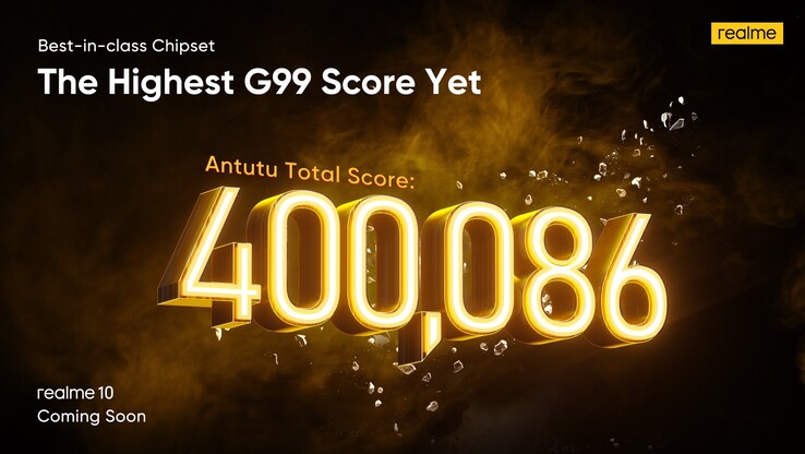 Ein weiteres Teaser-Bild stellt klar, dass das Basismodell der Serie mit einem MediaTek Helio G99 bestückt ist, der mit zwei ARM Cortex-A76-Performance-Kernen mit Taktfrequenzen bis 2,2 GHz und sechs ARM Cortex-A55-Kernen bei 2,0 GHz knapp über 400.000 Punkte auf AnTuTu erzielt. Der Leaker Paras Guglani hat bereits einige weitere Bilder geteilt, die das Design des Realme 10 4G zeigen, samt der auffällig glänzenden Rückseite, der flachen Kanten und der beiden Kameras.