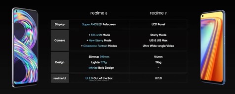 Neben dem Realme 8 Pro hat der Smartphone-Hersteller aus China heute auch das Realme 8 offiziell vorgestellt. Das Gerät ist mit 7,99 Millimeter und 177 Gramm im Vergleich zu den meisten Alternativen deutlich dünner und leichter. Realme setzt auf dasselbe 6,4 Zoll Super AMOLED-Display, das auch beim Pro-Modell zum Einsatz kommt, inklusive 1.080p+-Auflösung, einer Bildrate von 60 Hz, einer Touch-Abtastrate von 180 Hz und einer maximalen Helligkeit von 1.000 Nits. Der Fingerabdrucksensor wurde direkt ins Display integriert.