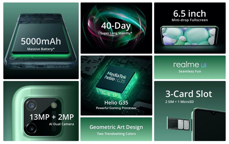 Das Realme C11 bietet ein 6,5 Zoll großes 720p+-Display, einen MediaTek Helio G35, 2 GB Arbeitsspeicher und 32 GB Flash-Speicher, der über eine microSD-Speicherkarte erweitert werden kann. Eines der Highlights des Smartphones ist der 5.000 mAh fassende Akku, der in Kombination mit dem sparsamen SoC für eine ordentliche Laufzeit sorgen dürfte.