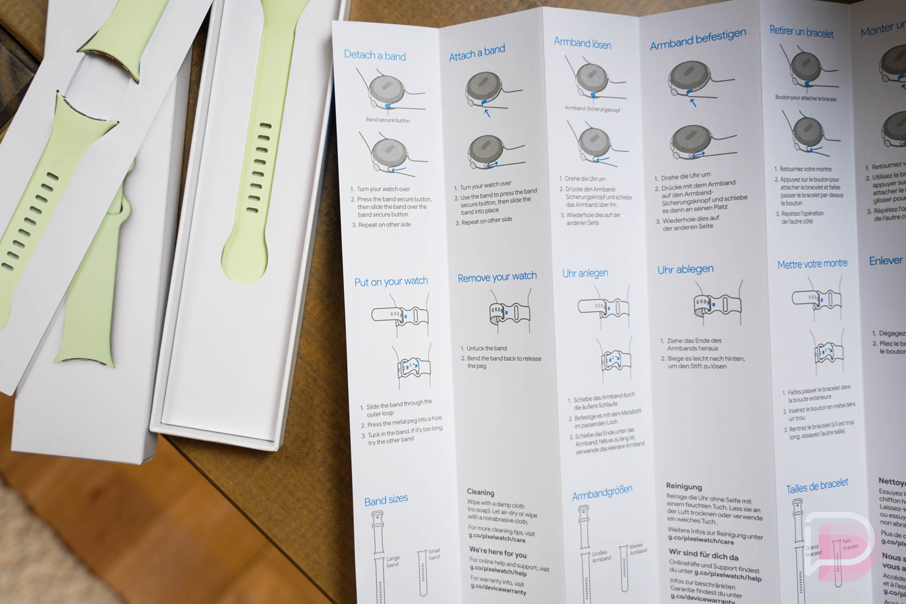 Die beigelegte Anleitung zeigt, wie das proprietäre Schnellwechsel-System der Google Pixel Watch funktioniert. Demnach muss lediglich ein Button an der Seite des Uhren-Gehäuses gedrückt werden, um das Armband entfernen zu können. Das macht es zwar einfach, das Armband zu tauschen, das System schränkt aber die Kompatibilität mit Drittanbieter-Armbändern ein.