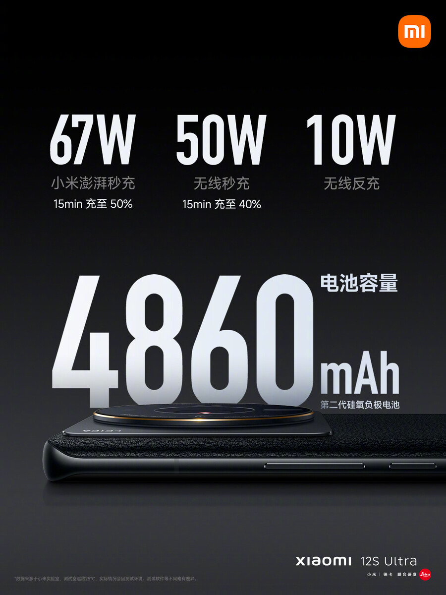 Der Fingerabdrucksensor wird unsichtbar ins Display integriert. Der Akku bietet eine Kapazität von 4.860 mAh, geladen wird wahlweise über USB-C mit bis zu 67 Watt oder drahtlos mit maximal 50 Watt, Reverse Wireless Charging ist mit maximal 10 Watt möglich. Der proprietäre Xiaomi Surge G1 soll die Laufzeit und die Lebensdauer des Akku verbessern. Das Xiaomi 12S Ultra wird mit MIUI 13 auf Basis von Android 12 ausgeliefert.
