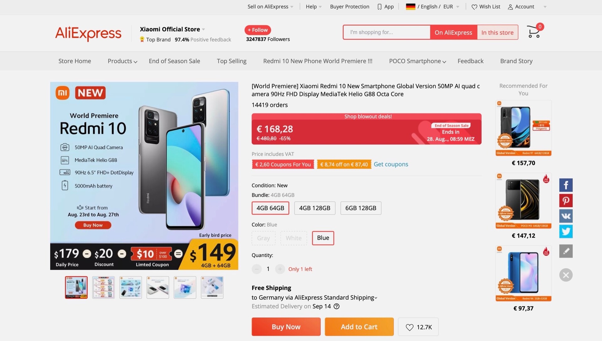Das Redmi 10 wurde erst vor wenigen Tagen vorgestellt, jetzt kann das Gerät über AliExpress bereits importiert werden. Das Basismodell mit 4 GB Arbeitsspeicher und 64 GB Flash-Speicher kostet dabei rund 168 Euro, der Versand ist kostenlos. Zu diesem Preis kommen aber noch ungefähr 52 Euro für Zoll, Einfuhrumsatzsteuer und DHL-Gebühr hinzu, sodass insgesamt etwa 220 Euro eingeplant werden müssen. Über Coupons, die direkt in der Shop-Seite eingeblendet werden, lassen sich noch ein paar Euro sparen.