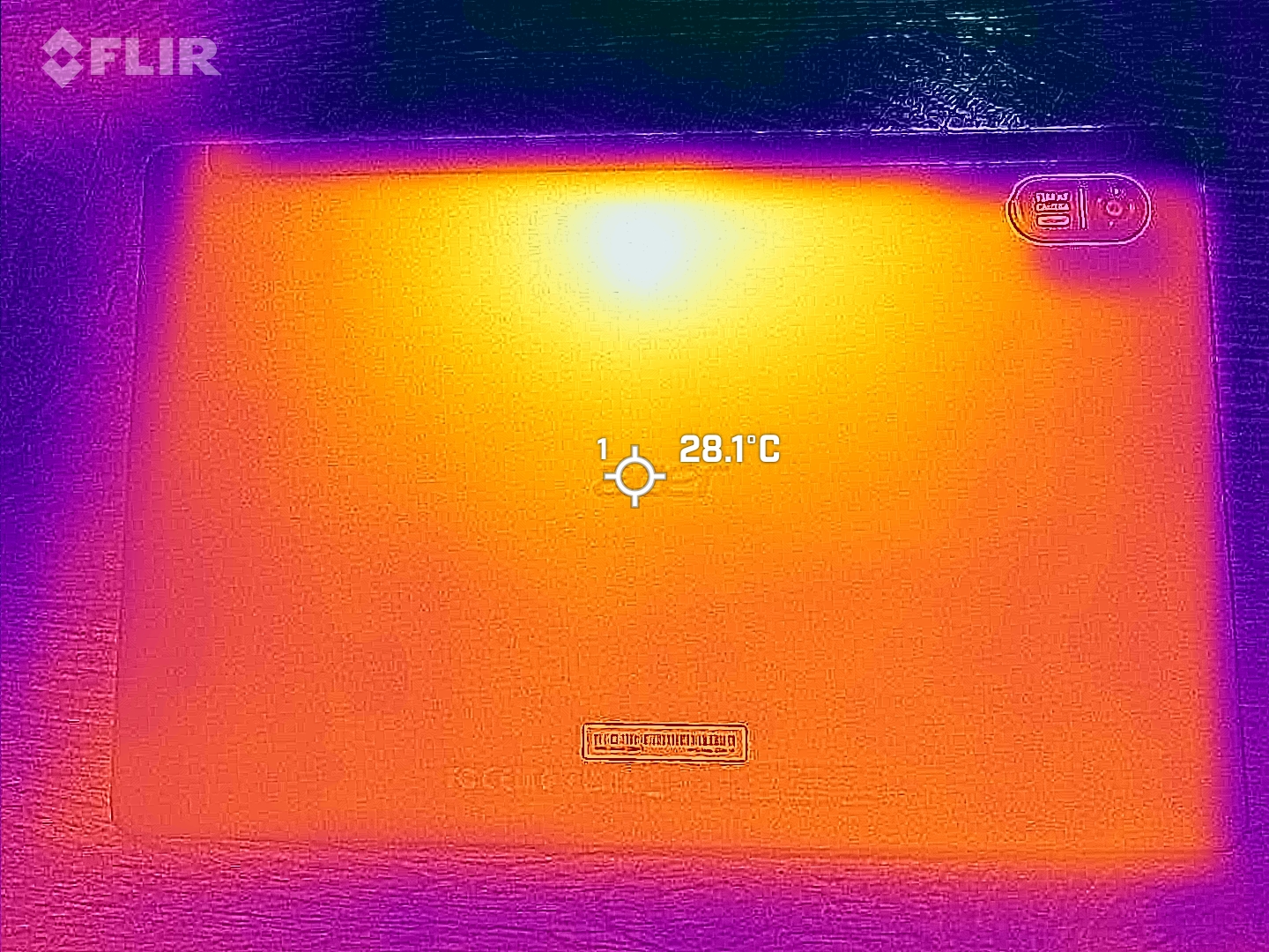 (+) Auf der Unterseite messen wir eine maximalen Wert von 33.3 °C (im Vergleich zum Durchschnitt von 33.2 °C).