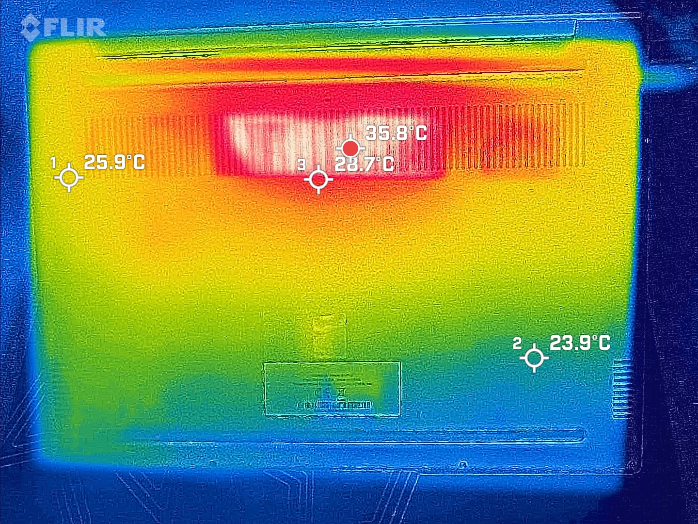 (+) Die Handballen und der Touchpad-Bereich sind mit gemessenen 26.2 °C kühler als die typische Hauttemperatur und fühlen sich dadurch kühl an.