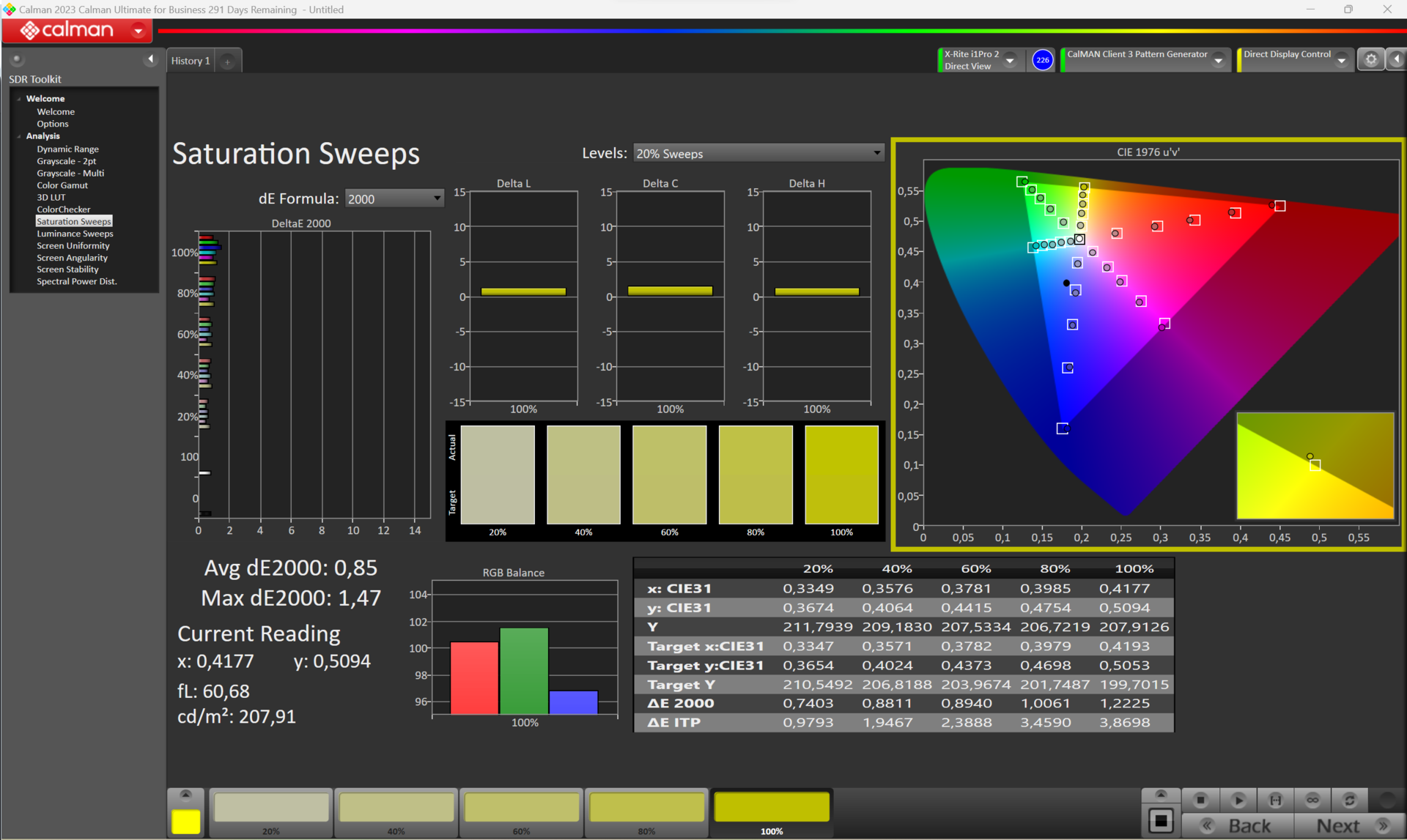 Die durchschnittlichen DeltaE-Werte der Graustufen, Farben und Sättigung sind bereits vor der Kalibrierung mit Werten zwischen 2 und 2,5 gut, können aber durch die Kalibrierung noch deutlich verbessert werden. Die durchschnittlichen DeltaE-Werte der Graustufen liegen nach der Kalibrierung bei sehr guten 0,4, die der Farben bei 0,95 und die Messwerte der Sättigung können auf 0,85 verbessert werden. Es lohnt sich also, das Display kalibrieren zu lassen, auch wenn die Werte für ein IPS-Panel bereits überdurchschnittlich gut sind. Unser verwendetes Farbprofil für die Kalibrierung lässt sich im Abschnitt der Displayinformationen herunterladen.