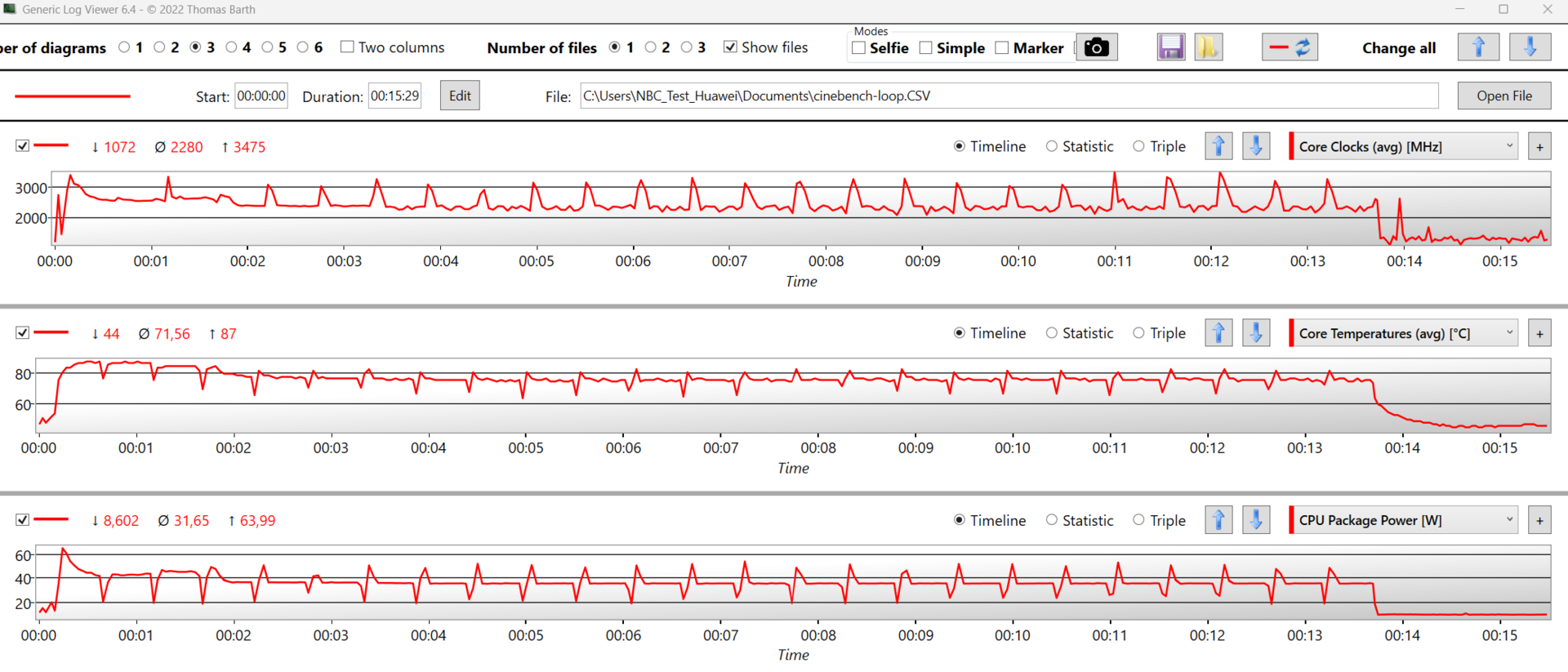 Während der Vorgänger noch auf den Vierkerner Intel Core i7-1165G7 setzte, ist im neuen Huawei MateBook ein Core i5-1240P mit 12 Kernen verbaut, was in fast allen Benchmarks zu deutlich besseren Ergebnissen führt. In unserem Cinebench-R15-Loop startet der Prozessor mit knapp 3,5 GHz, fällt dann aber schnell auf etwa 2,6 GHz ab. Nach zwei Minuten sinkt die Leistung erneut auf ca. 2,4 GHz und nach ca. 4 Minuten pendelt sich der Prozessor bei 2,2 GHz mit periodischem Wechsel auf 3,2 bis 3,4 GHz ein. Nach einem Spitzenverbrauch von über 60 Watt zu Beginn des Loops liegt der Verbrauch während des Benchmarks im Mittel bei knapp 32 Watt. Die Kerntemperaturen liegen mit maximal 87°C und durchschnittlich 72°C deutlich unter denen des Vorgängers mit durchschnittlich 83°C.