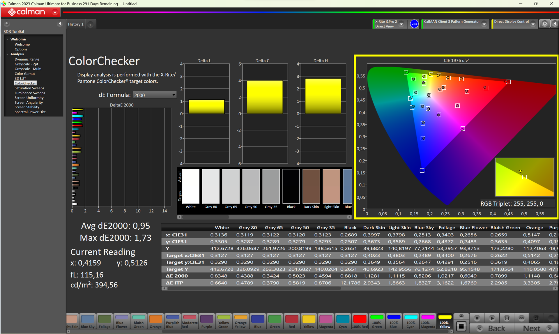 | Delta E Colorchecker * | 2.04 | 1.3 36% | 1.92 6% | 3.11 -52% | 3.65 -79% | 6.32 -210% | 2.6 -27% |