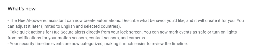 Mit der neuen Version erweitert Philips Hue die Funktionen des Hue AI Assistant. Nutzer können nun Automatisierungen erstellen, indem sie dem Assistenten einfach beschreiben, welches Verhalten sie wünschen. Auf dieser Grundlage generiert das Tool automatisch eine passende Automatisierung, die anschließend manuell angepasst werden kann. Der Hue AI Assistant steht derzeit nur zur Verfügung, wenn die App-Sprache auf Englisch eingestellt ist, und ist bislang nicht in allen Ländern verfügbar.