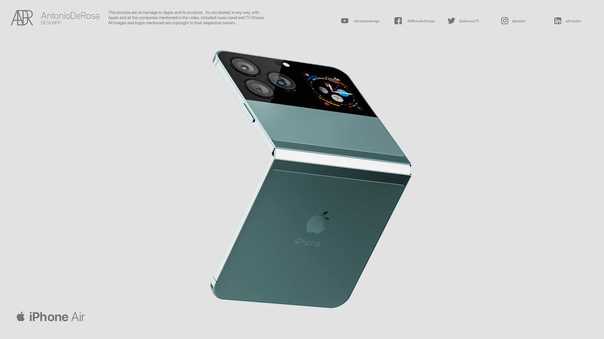 Der Designer Antonio De Rosa zeigt im unten eingebetteten Video ein Konzept-Design eines sogenannten "iPhone Air". Das Konzept soll zeigen, wie schick ein Falt-Phone im Stil des Samsung Galaxy Z Flip3 5G (ca. 1.070 Euro auf Amazon) sein könnte, wenn es im Stil des iPhone 13 Pro ausgeführt wäre. Das Smartphone im Konzept ist ultradünn und mit einem interessanten Zweitdisplay ausgestattet, das im Format einer Apple Watch ausgeführt ist.