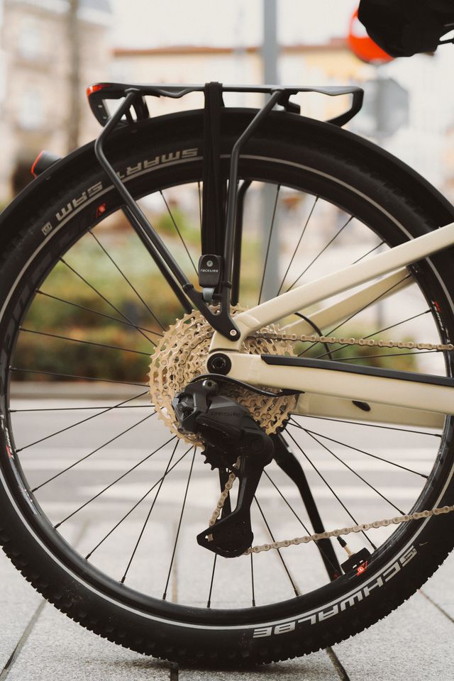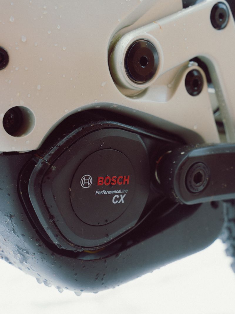 Verbaut ist ein Bosch Performance Line CX-Motor, wobei dieser ein Drehmoment von bis 100 Nm bieten soll und mit bis zu 400 Prozent unterstützen kann. Gespeist wird der Motor von einem herausnehmbaren Akku mit einer Kapazität von 800 Wh, wobei dieser in den Rahmen eingefügt und damit relativ gut geschützt ist. Zudem ergibt sich eine etwas cleanere Optik. Genutzt wird das Bosch Kiox 300-Display. Dieses ist noch relativ kompakt, allerdings lassen sich auch Navigationshinweise anzeigen. Mit der LED Remote lassen sich Modi und Funktionen steuern, ohne die Hände vom Lenker zu nehmen.