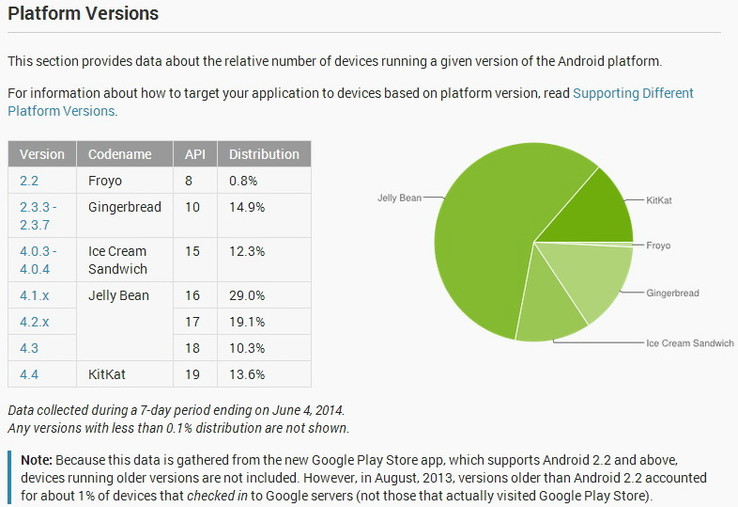 Für Googles neueste Android-Version 4.4 KitKat ging es beim Anteil der Zugriffe auf den Google Play App Store bis 4. Juni weiter ganz steil nach oben. Lag der Anteil von Googles neuester Version seines Mobile-Betriebssystems Android 4.4 KitKat im März 2014 noch bei mageren 2,5 Prozent, so machte Android 4.4 KitKat jetzt einen weiteren gewaltigen Sprung über die 10-Prozent-Marke. Das Google Dashboard nennt für Android 4.4 KitKat in der jüngsten Ausweisung jetzt 13,6 Prozent.