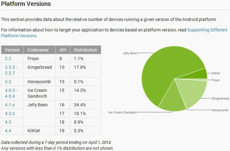 Im Gegenzug schrumpfte der Anteil von Android 4.3 Jelly Bean im April von 9,6 auf 8,9 Prozent. Auch Version 4.1.x verlor von 35,3 auf 34,4 Prozentpunkte. Lediglich für Android 4.2.x steht bei den Jelly-Bean-Versionen mit 18,1 Prozent (März 2014: 17,1 %) ein kleines Plus von 1 Prozent. Googles Ice Cream Sandwich Android 4.0.3 bis 4.0.4 hat ebenso Anteile eingebüßt und rangiert nun bei 14,3 Prozent (Vormonat: 15,2 %).
