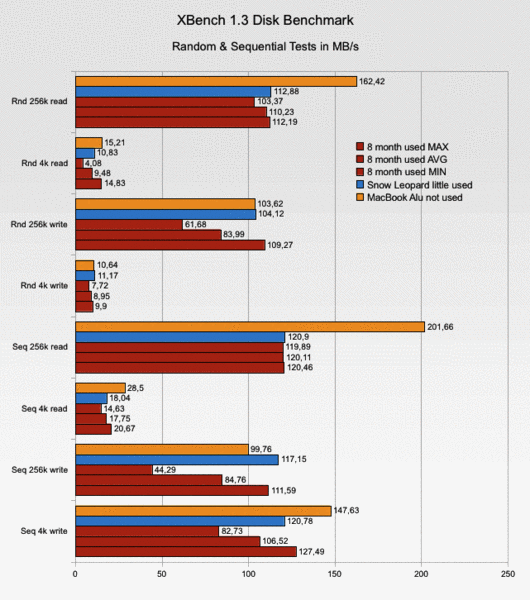 Als Benchmarkvergleich haben wir den Disk Benchmark des XBench 1.3 für Mac OS X herangezogen. Hier haben wir die Daten der neuen Torqx aus einem 2.0 GHz MacBook Aluminium aus 2008 (oranger Balken), Daten nach der Snow Leopard Umstellung des MBP 2.2 (schon etwas bentuzt, blauer Balken) und die Durchschnittsergebnisse der Torqx nach 8 Monaten Nutzung (rote Balken, Minimale, Durschnitts- und Maximalwerte).