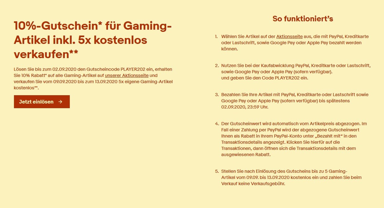 Aber es kann nicht nur beim Kauf gespart werden: Vom 9. bis zum 13. September 2020 können Gaming-Fans bei eBay bis zu 5 Artikel aus den Kategorien PC- und Videospiele sowie Konsolen kostenlos einstellen und zahlen beim Verkauf keine Verkaufsgebühren.