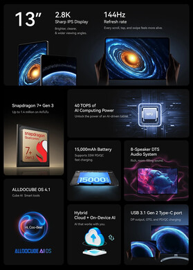 Das Alldocube Ultra Pad ist ein beeindruckendes Tablet. Angetrieben wird das 13 Zoll große Gerät vom Qualcomm Snapdragon 7+ Gen 3. Der Octa-Core-Prozessor liefert nahezu Flaggschiff-Leistung samt 40 TOPS KI-Power, bewältigt so anspruchsvolle Anwendungen, Multitasking und KI-Beschleunigung mühelos. In Kombination mit 12 GB RAM und 256 GB UFS-Speicher (erweiterbar per microSD) ist zügiges Wechseln zwischen Anwendungen und flexible Dateispeicherung garantiert.
