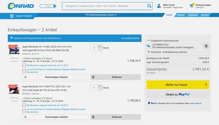 Dank einer Gutscheinaktion kann das aktuelle MacBook Air mit Apple M2, 8 GB RAM und 256 GB SSD bei Conrad aktuell für nur 1.196 Euro bestellt werden. Um auf diesen Preis zu kommen, muss der Gutscheincode "LASTMINUTE22" im Warenkorb angegeben werden. Im Preisvergleich ist dasselbe Gerät ansonsten nicht unter 1.249 Euro zu finden, Apple veranschlagt für das Basismodell 1.499 Euro.