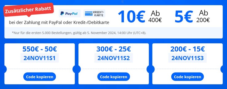 Das Ninkear A15 Plus ist nicht das einzige Schnäppchen, das es aktuell bei Geekbuying gibt. Der Onlineshop hat anlässlich des 11.11 Sales zahlreiche Produkte massiv im Preis gesenkt. Zusätzlich gewährt man weitere Rabatte durch Gutscheincodes, die auf der Aktionsseite zu finden sind. Und wer seinen Einkauf per PayPal bzw. Kredit- bzw. Debitkarte bezahlt, spart ab 200 Euro Bestellwert weitere 5 Euro bzw. ab 400 Euro sogar 10 Euro.