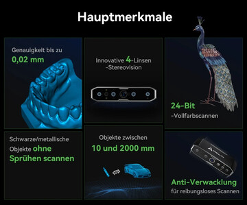 Der Handscanner ist mit 4-Linsen-Stereovision ausgestattet, die mit 24-Bit-Vollfarbscannen und hoher Detailgenauigkeit von 0,02 mm scannen können. Die Geschwindigkeit liegt bei 20 fps (Bilder pro Sekunde), während das Gerät Objekte von 10 bis 2.000 mm erfassen kann.