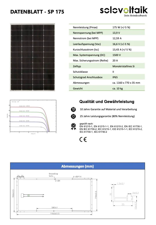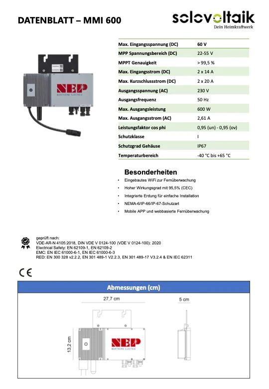 Die Mini-Solaranlage ist mit zwei Solarmodulen á 175 Wp von Solovoltaik mit PERC-Zelltechnologie und Abmessungen von je ca. 116 x 77 cm ausgestattet, einem NEP-Wechselrichter mit einer Leistung von 600 Watt und einem Spitzenwirkungsgrad von ca. 95,5 Prozent, vier Haltern für einen Gitterbalkon inklusive Schrauben, einem fünf Meter langen Schuko-Kabel für die Haushalts-Steckdose sowie einer mobilen App zum Auslesen der Daten der Solarmodule.