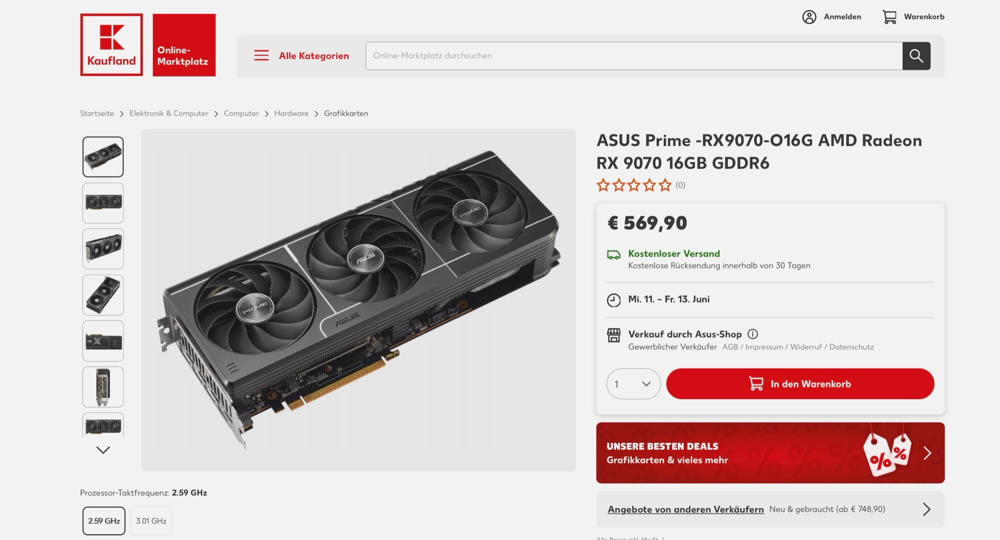 Die AMD Radeon RX 9070 gibts aktuell bei Kaufland für nur 569,90 Euro, der Verkauf erfolgt über den offiziellen Kaufland-Shop von Asus. Damit wird die Grafikkarte 60 Euro unter der unverbindlichen Preisempfehlung der Radeon RX 970 angeboten, die bei 629 Euro liegt. Laut Preisvergleich handelt es sich dabei um den Allzeit-Bestpreis für diese Variante der Grafikkarte, die bis gestern nicht unter 669 Euro zu bekommen war.