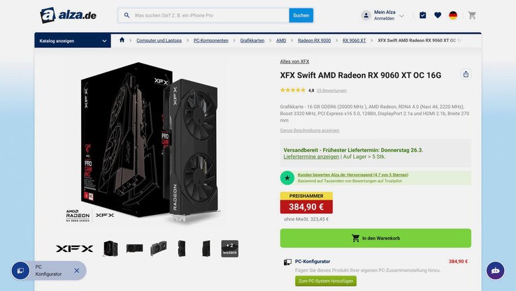 Die XFX Swift Radeon RX 9060 XT OC mit 16 GB GDDR6-Grafikspeicher wird aktuell bei Alza für nur 384,90 Euro zuzüglich 4,99 Euro Versand angeboten. Laut Preisvergleich handelt es sich dabei aktuell um die günstigste AMD Radeon RX 9060 XT 16 GB, dasselbe Modell war bis zum Start dieser Aktion nicht unter 404,90 Euro zu bekommen.