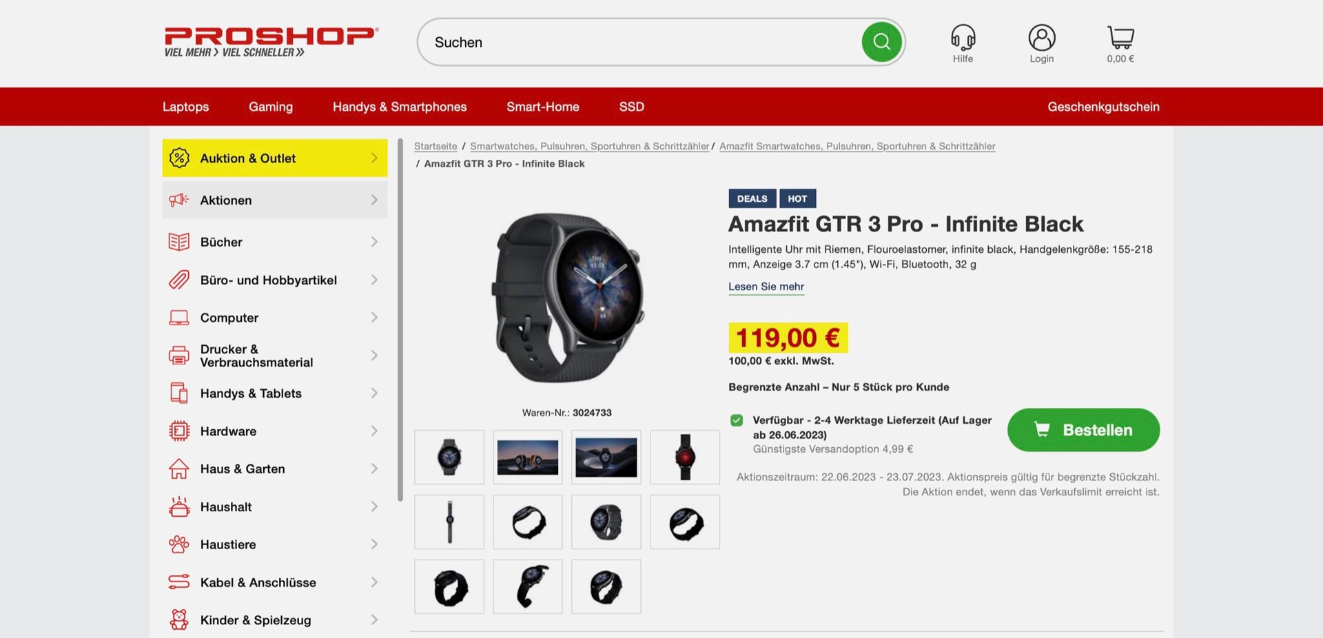 Die Amazfit GTR 3 Pro wird aktuell bei Proshop für nur 119 Euro angeboten, zuzüglich 4,99 Euro Versand, wahlweise in Schwarz mit Sportarmband, oder in Gold mit Lederarmband. Im Preisvergleich ist die schwarze Version ansonsten nicht unter 139 Euro zu finden, die goldene Variante kostet ansonsten mindestens 159 Euro.