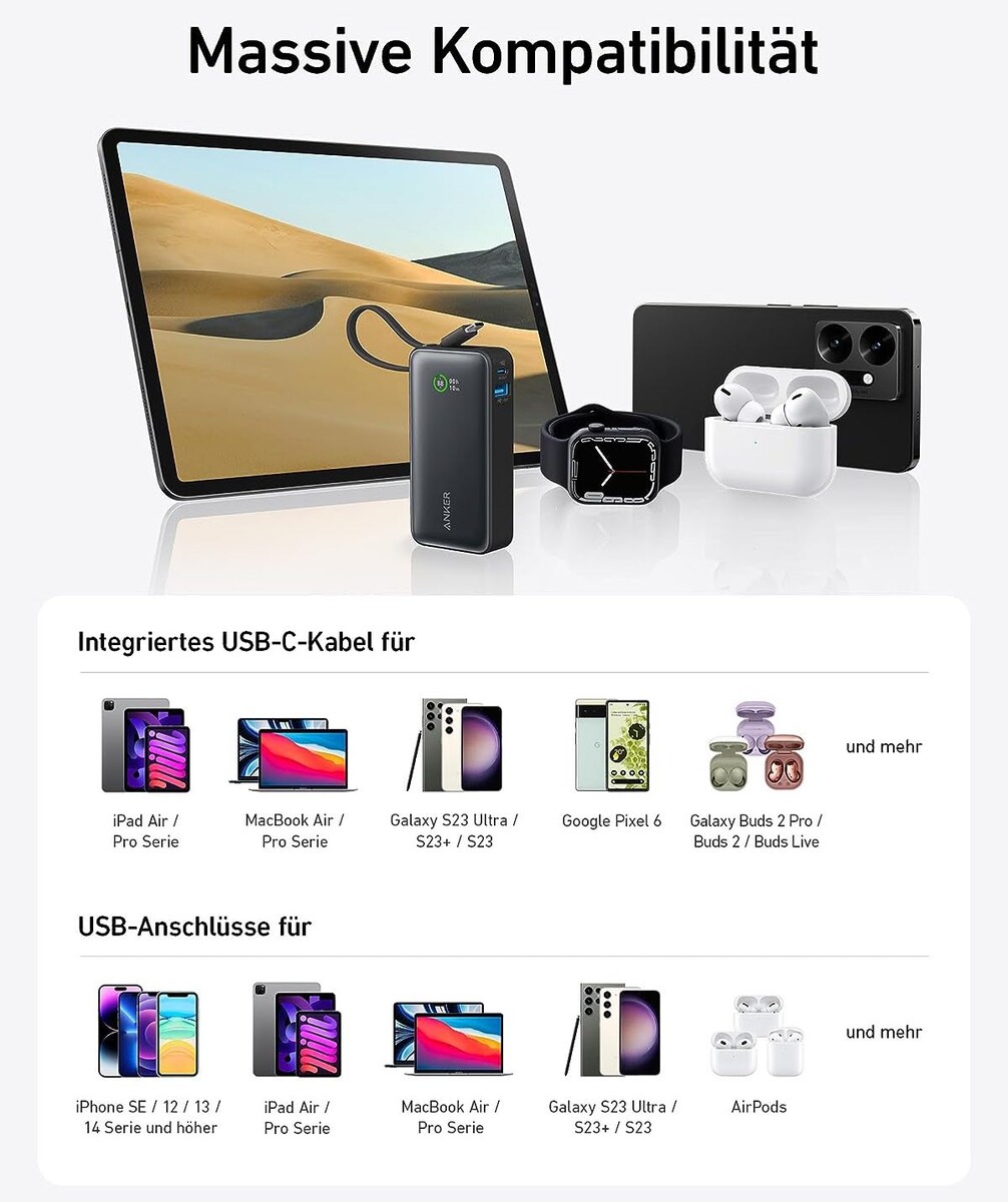 Neben diesem fest verbauten Flachkabel ist die Anker-Powerbank mit einem zusätzlichen USB-C und einem USB-A-Port ausgestattet. Die maximale Ladegeschwindigkeit der Nano liegt bei 30 Watt, ein reguläres Apple iPhone 15 kann damit innerhalb einer halben Stunde von 0 auf 50 Prozent aufgeladen werden. Mit Abmessungen von 104 x 52,3 x 26 Millimetern ist das Gadget gemessen an seiner Kapazität von 10.000 mAh angenehm kompakt, weshalb Power-Nutzer von energiehungrigen Smartphones bei diesem Deal für die brandneue Anker Nano Powerbank ein paar Euro sparen können.