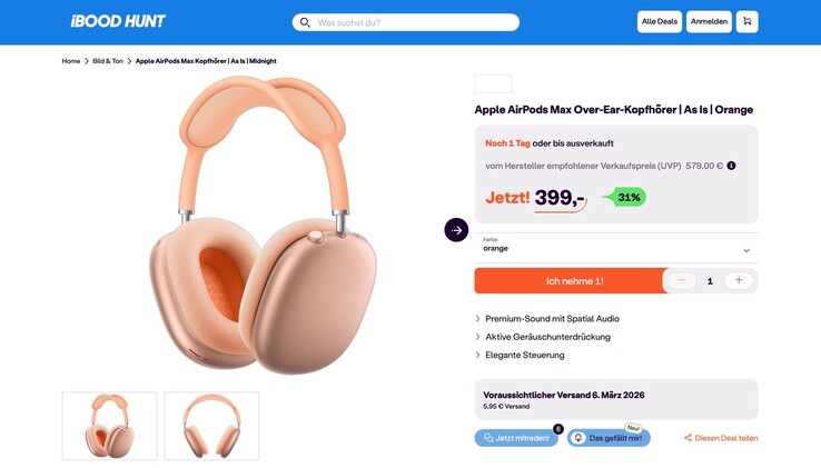 Die Apple AirPods Max werden aktuell bei iBood für nur 399 Euro zuzüglich 4,95 Euro Versandkosten angeboten, wahlweise in Schwarz, Orange, Violett, Blau oder Gold. Laut Preisvergleich waren Apples Over-Ear-Kopfhörer noch nie zuvor so günstig zu bekommen, aktuell sind die AirPods Max ansonsten nicht unter 474 Euro zu finden, der Listenpreis liegt bei 579 Euro. Das Angebot bei iBood gilt nur einen Tag, oder solange der Vorrat reicht.