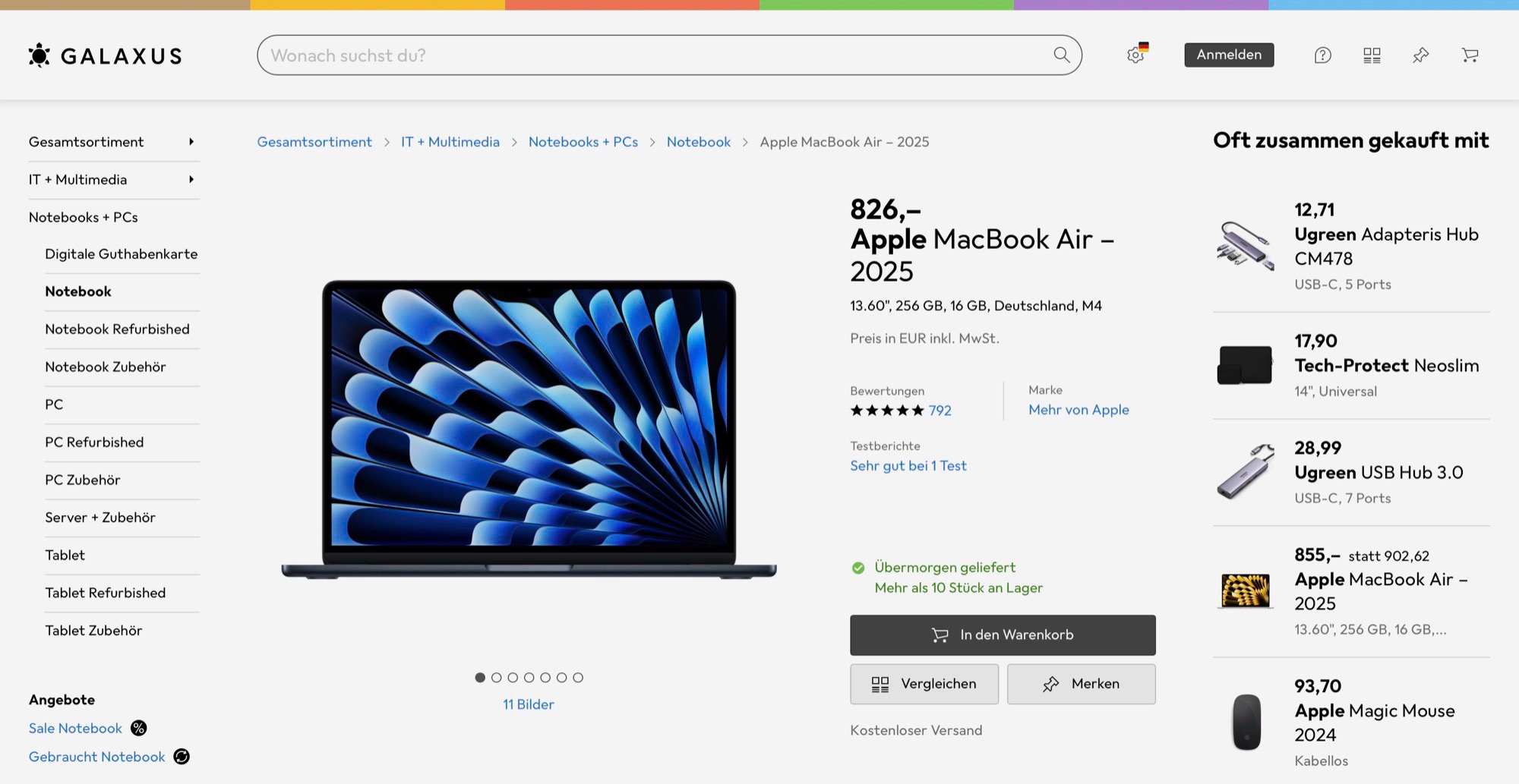 Das 13 Zoll MacBook Air mit Apple M4, 16 GB RAM und 256 GB SSD in der Farbe "Midnight" wird aktuell bei Galaxus für nur 826 Euro angeboten, der Versand ist kostenlos. Im Preisvergleich ist dasselbe Modell derzeit ansonsten nicht unter 855 Euro zu finden. Zum Bestpreis ist das MacBook Air eine interessante Alternative zum MacBook Neo, das mit 256 GB SSD ohne Touch ID derzeit 649 Euro kostet, mit 512 GB SSD und Fingerabdrucksensor 749 Euro.
