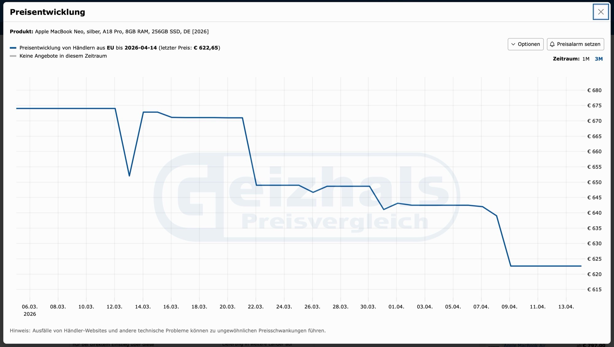 Das MacBook Neo ist erst Anfang März 2026 auf den Markt gekommen, wahlweise mit 256 GB Speicher für einen Listenpreis von 699 Euro, oder mit 512 GB SSD und Touch ID Fingerabdrucksensor für eine UVP von 799 Euro. Wie ein Blick auf den Preisvergleich zeigt, werden beide Varianten des MacBook Neo im freien Handel nun in allen Farben deutlich günstiger angeboten.