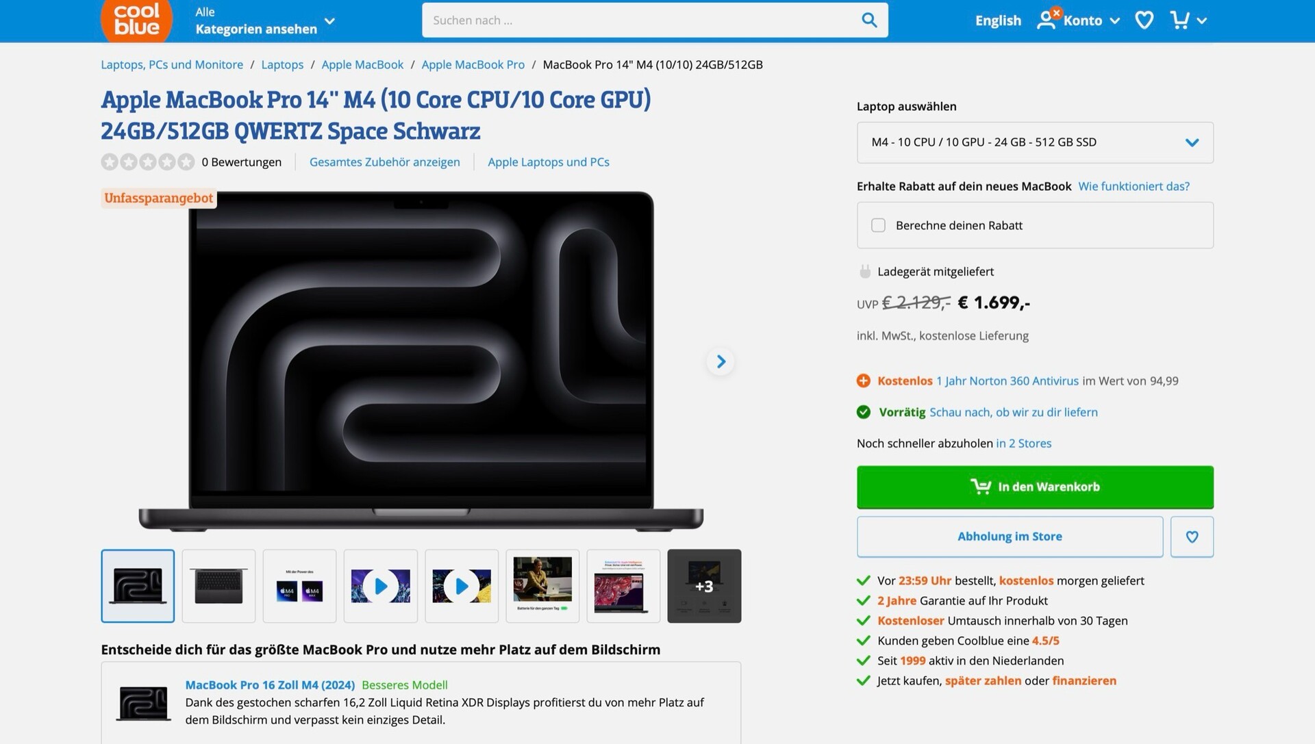 Das MacBook Pro mit Apple M4, 24 GB RAM und 512 GB SSD wird aktuell bei Coolblue für nur 1.699 Euro angeboten, der Versand ist kostenlos. Zum Vergleich: Dasselbe Modell kostet bei Apple 2.149 Euro. Im Preisvergleich ist diese Variante des MacBook Pro zwar schon ab 1.695 Euro zu finden, allerdings mit unbestimmtem Lieferdatum – kurzfristig lieferbar kostet das Notebook ansonsten mindestens 1.849 Euro.