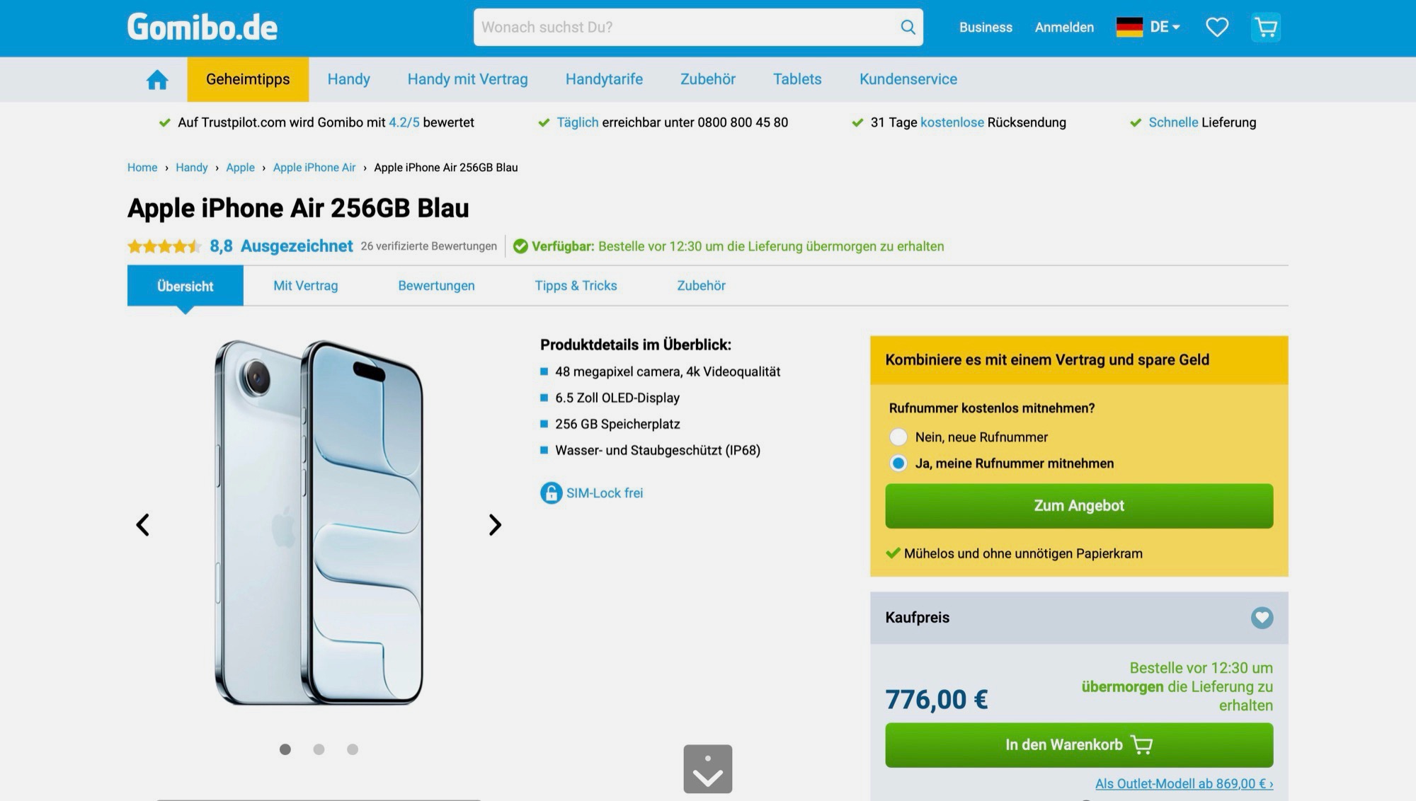 Das Apple iPhone Air in Himmelblau mit 256 GB Speicher wird derzeit bei Gomibo für nur 776 Euro angeboten. Das iPhone Air ist vergangenen September für eine unverbindliche Preisempfehlung von 1.199 Euro auf den Markt gekommen, im Preisvergleich ist das Smartphone derzeit ansonsten nicht für unter 845 Euro zu finden, der Allzeit-Bestpreis lag bisher bei 803 Euro.