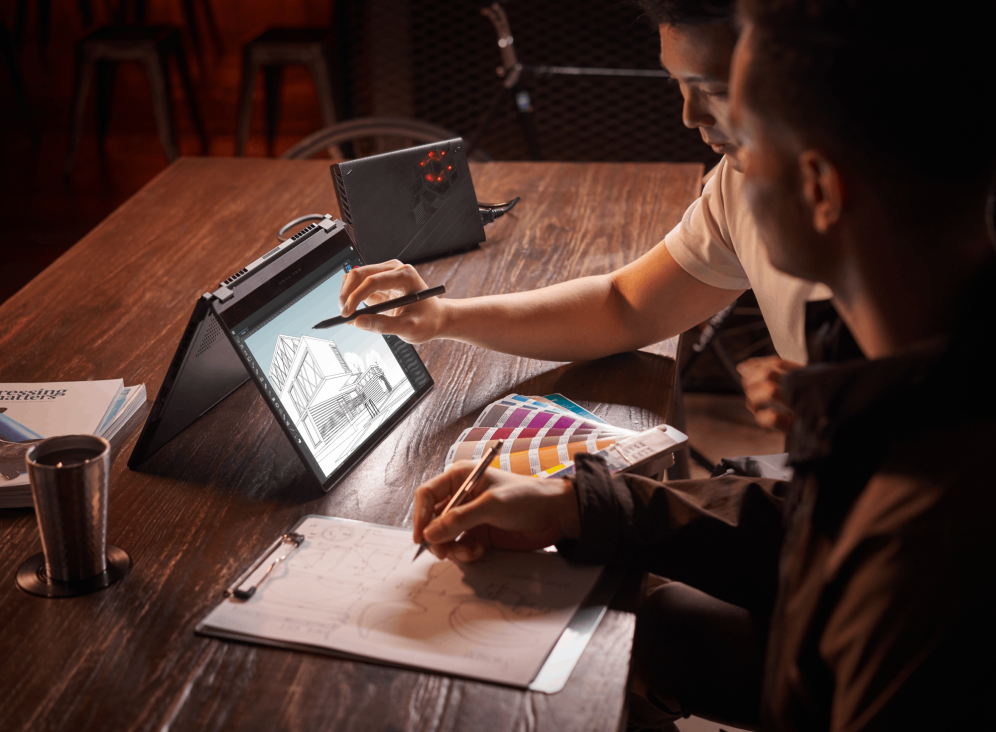 Das Windows 2-in-1 mit Tablet-Funktion ist für Gaming in der nativen Auflösung gerüstet, wenngleich die TGP der RTX 3050 Ti bei maximal 40 Watt liegt. Wenn man anspruchsvollere Games bei hohen Details zocken möchte, kann man das separat erhältliche eGPU-Dock Asus ROG XG Mobile mit einer RTX 3080 Laptop-GPU nutzen.
