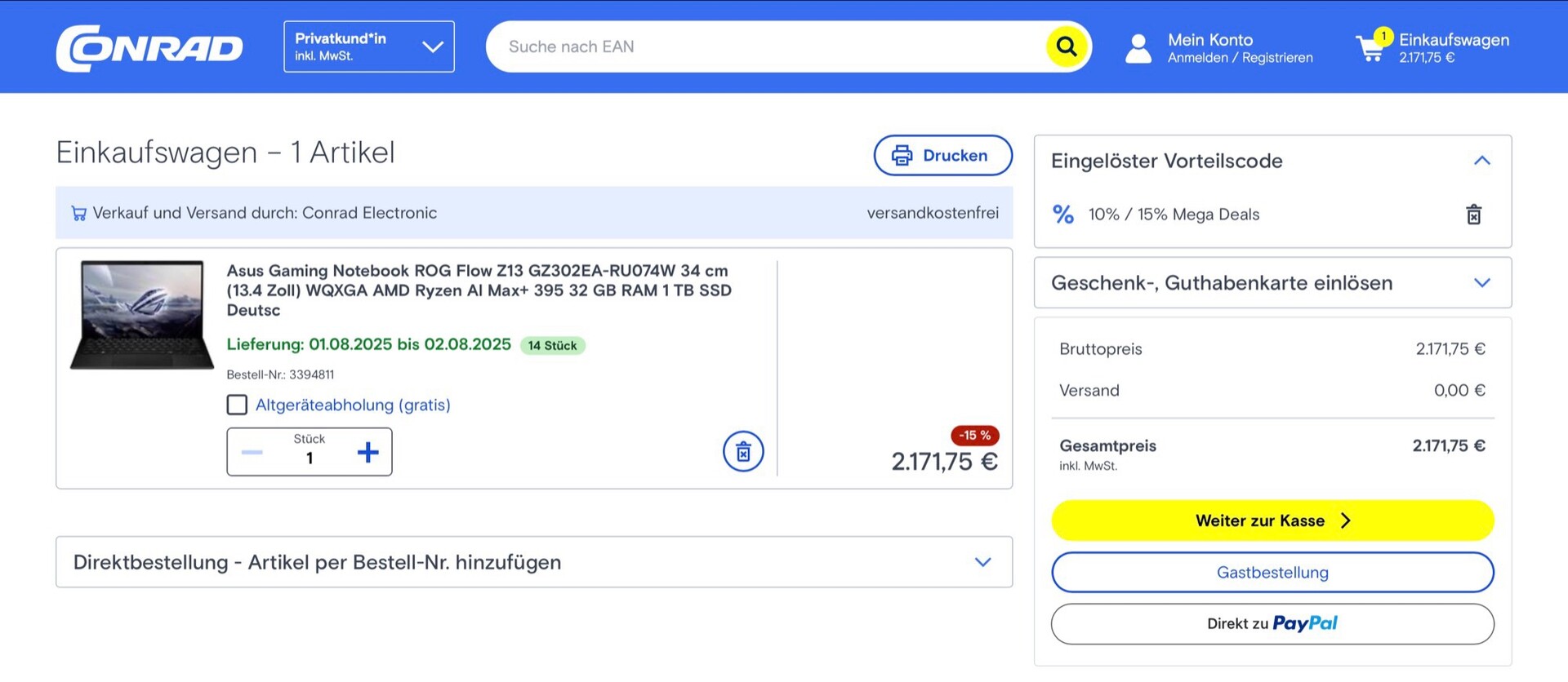 Das Asus ROG Flow Z13 wird derzeit bei Conrad für nur 2.172 Euro angeboten, der Versand ist kostenlos. Um auf diesen Preis zu kommen, muss der Gutscheincode "DEAL725" im Warenkorb eingegeben werden. Laut Preisvergleich handelt es sich dabei um den Allzeit-Bestpreis für das Convertible, das derzeit in Deutschland ansonsten nicht unter 2.489 Euro zu bekommen ist.