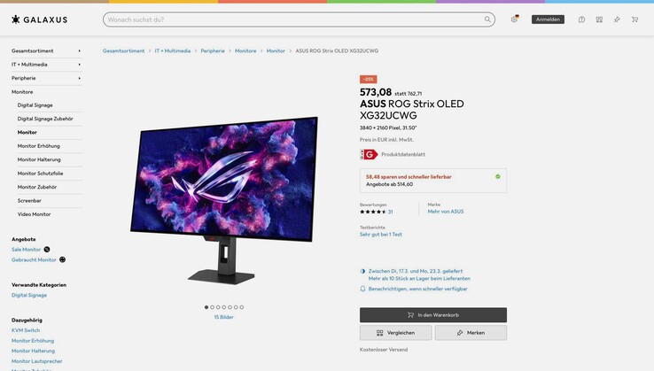 Der Asus ROG Strix OLED XG32UCWG Gaming-Monitor wird aktuell bei Galaxus für nur 573 Euro angeboten, der Versand ist kostenlos. Monitore, die von Kunden zurückgeschickt wurden, gibts sogar für nur 514,60 Euro, wobei diese minimale Gebrauchsspuren aufweisen können. Laut Preisvergleich handelt es sich dabei um den Allzeit-Bestpreis für den Bildschirm, der bis zum Start dieser Aktion nicht unter 749 Euro zu finden war.