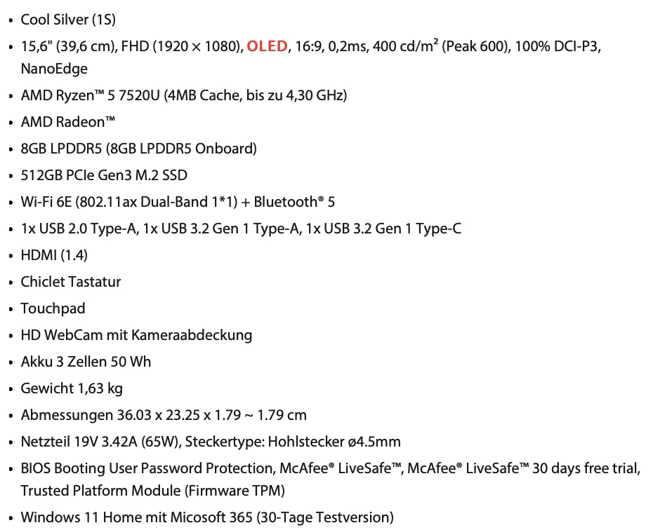 Das größte Kaufargument des Vivobook Go 15 dürfte, wie bereits angedeutet, das prächtige Full-HD-OLED-Display mit vollständiger Abdeckung des DCI-P3-Farbraums, Pantone-Zertifizierung sowie einer Spitzenhelligkeit von 600 Nits sein. Als Konnektivitätsoptionen stehen neben USB-C 3.2 zwei USB-A-Ports sowie HDMI 1.4 zur Verfügung. Der größte Nachteil dieser AMD-Konfiguration ist der nicht aufrüstbare und ziemlich eng bemessene Arbeitsspeicher, womit dieser Deal hauptsächlich für Normalnutzer gedacht ist, die ein bildstarkes OLED-Notebook für genügsame Multimedia-Anwendungen wie die beispielsweise die gelegentliche Foto-Bearbeitung suchen.