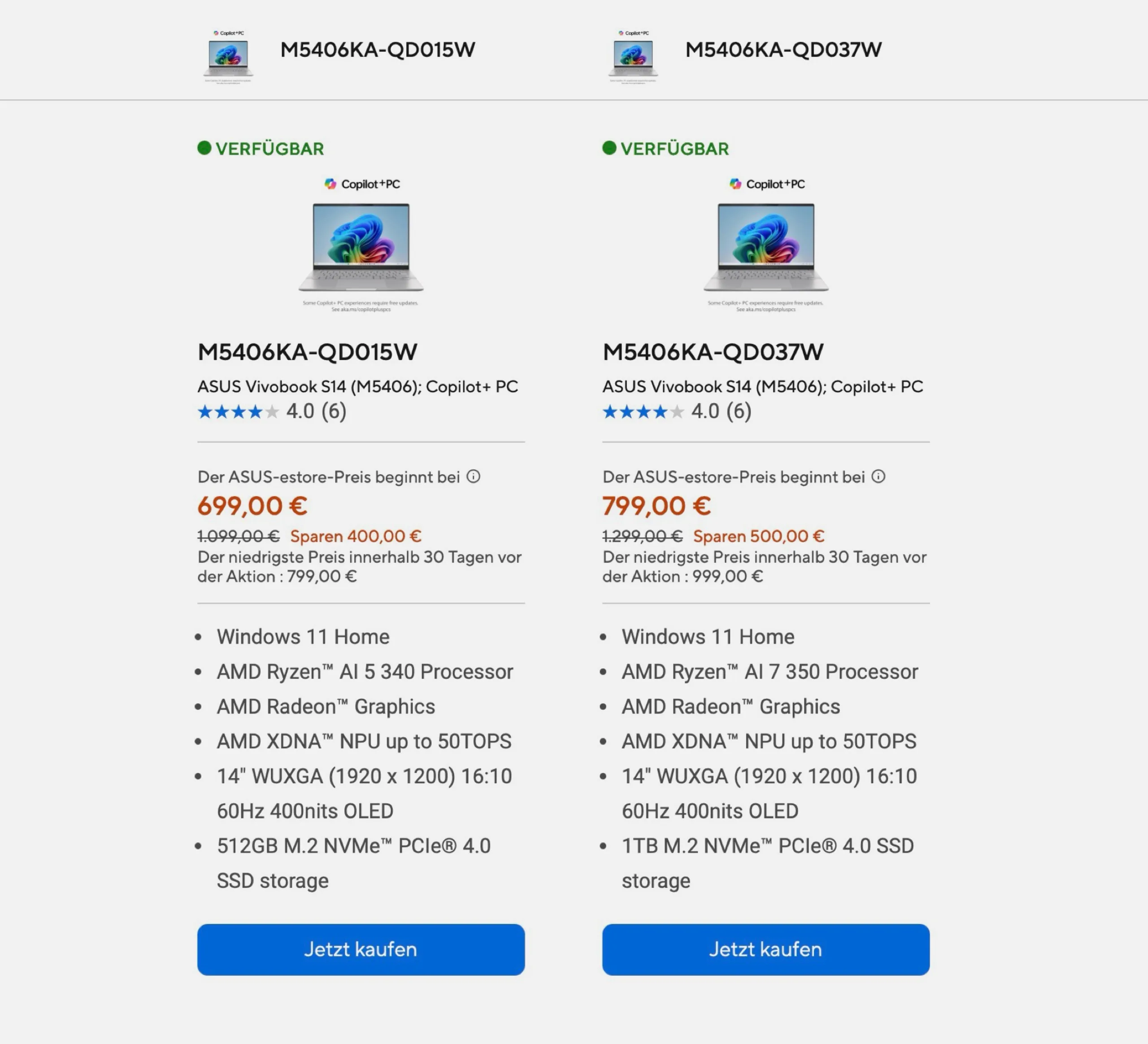 Das Asus Vivobook S14 (M5406) ist im Mai für eine unverbindliche Preisempfehlung von 999 Euro auf den Markt gekommen, aktuell gibts das Notebook im Asus Onlineshop für nur 699 Euro. Das ist laut Preisvergleich der Allzeit-Bestpreis für den Laptop, der aktuell ansonsten nicht unter 799 Euro zu bekommen ist.