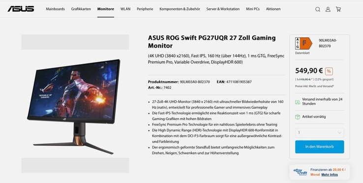 Der Asus ROG Swift PG27UQR wird derzeit sowohl im Asus Onlineshop als auch auf Amazon für nur 549,90 Euro angeboten. Im Preisvergleich war der Bildschirm vor dem Start dieser Aktion nicht unter 679 Euro zu finden.