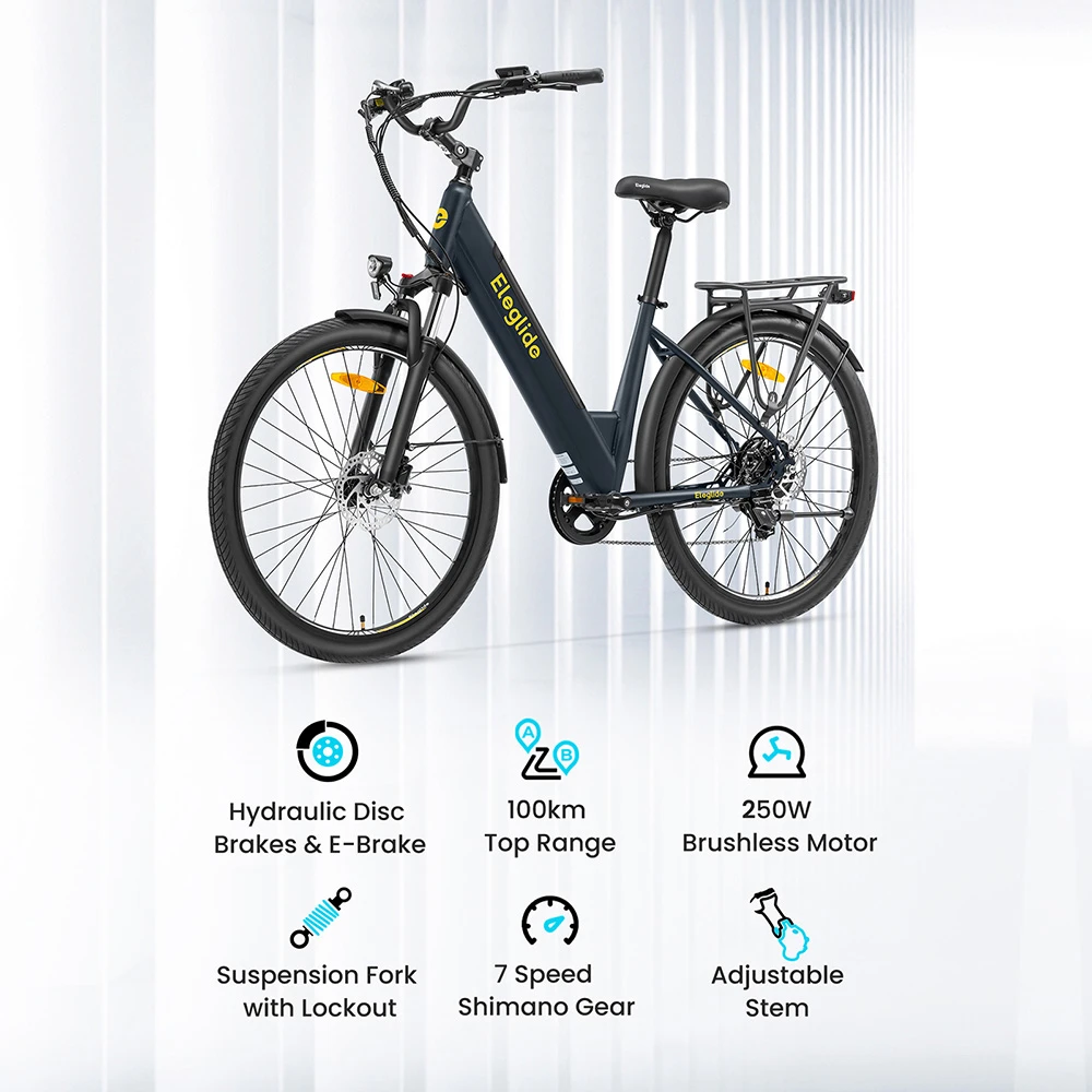 Das Eleglide T2 ist ein gut ausgestattetes E-Bike, mit dem sich bequem Besorgungen in der Stadt erledigen lassen, mit dem aber auch am Wochenende längere Touren durch die Natur möglich sind. Es ist mit einem Tiefeinsteigerrahmen ausgestattet, was ein bequemes Auf- und Absteigen ermöglicht.