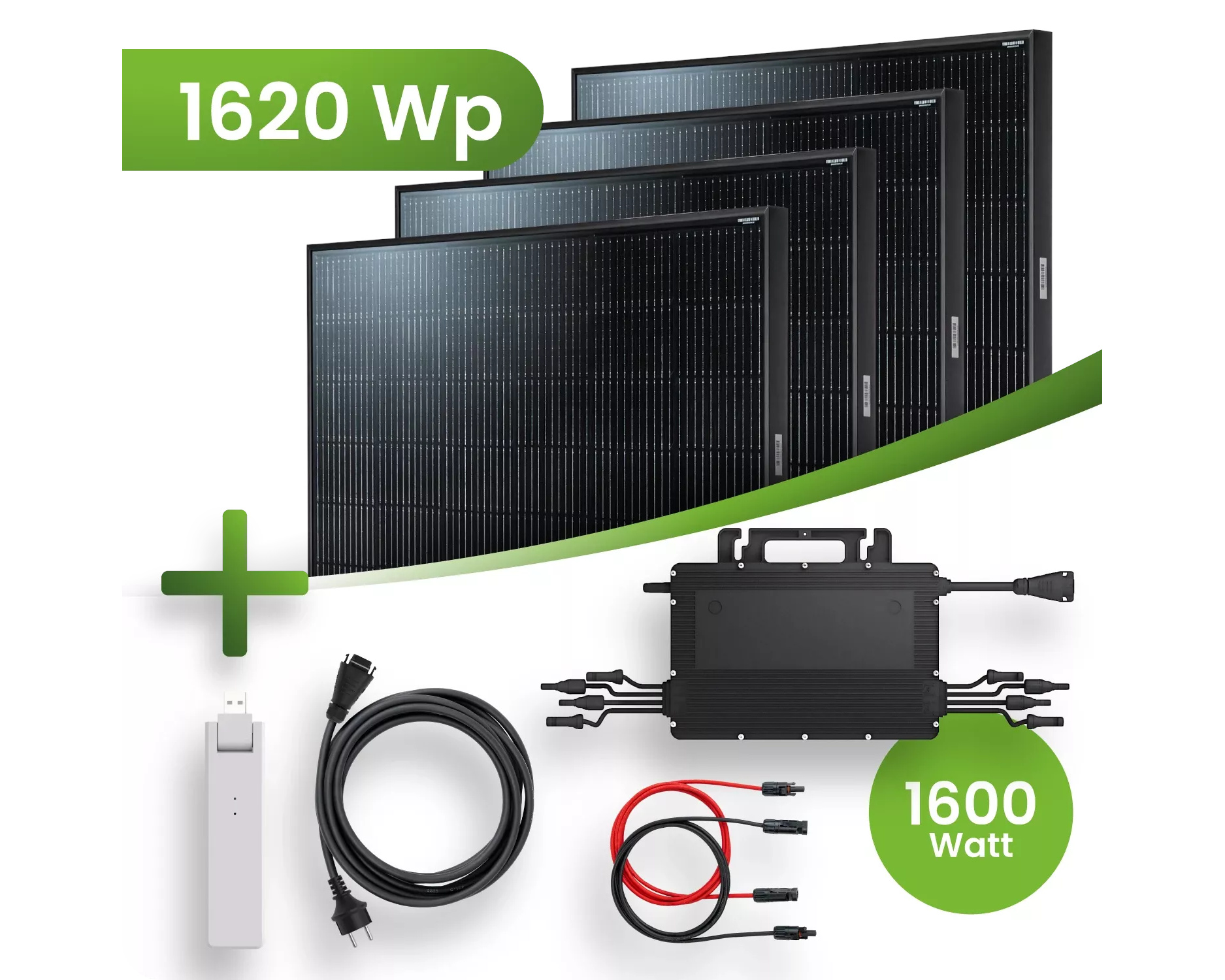 Außerdem enthält das PV-Set nebst Zubehör einen Mikro-Wechselrichter Hoymiles HMS-1600-4T mit einer Leistung von 1.600 Watt Peak. Eine Drosselung der Wechselrichtereingänge auf 800 W ist möglich und kann vor dem Versand kostenlos beim Verkäufer bestellt werden.