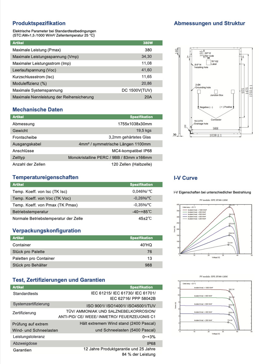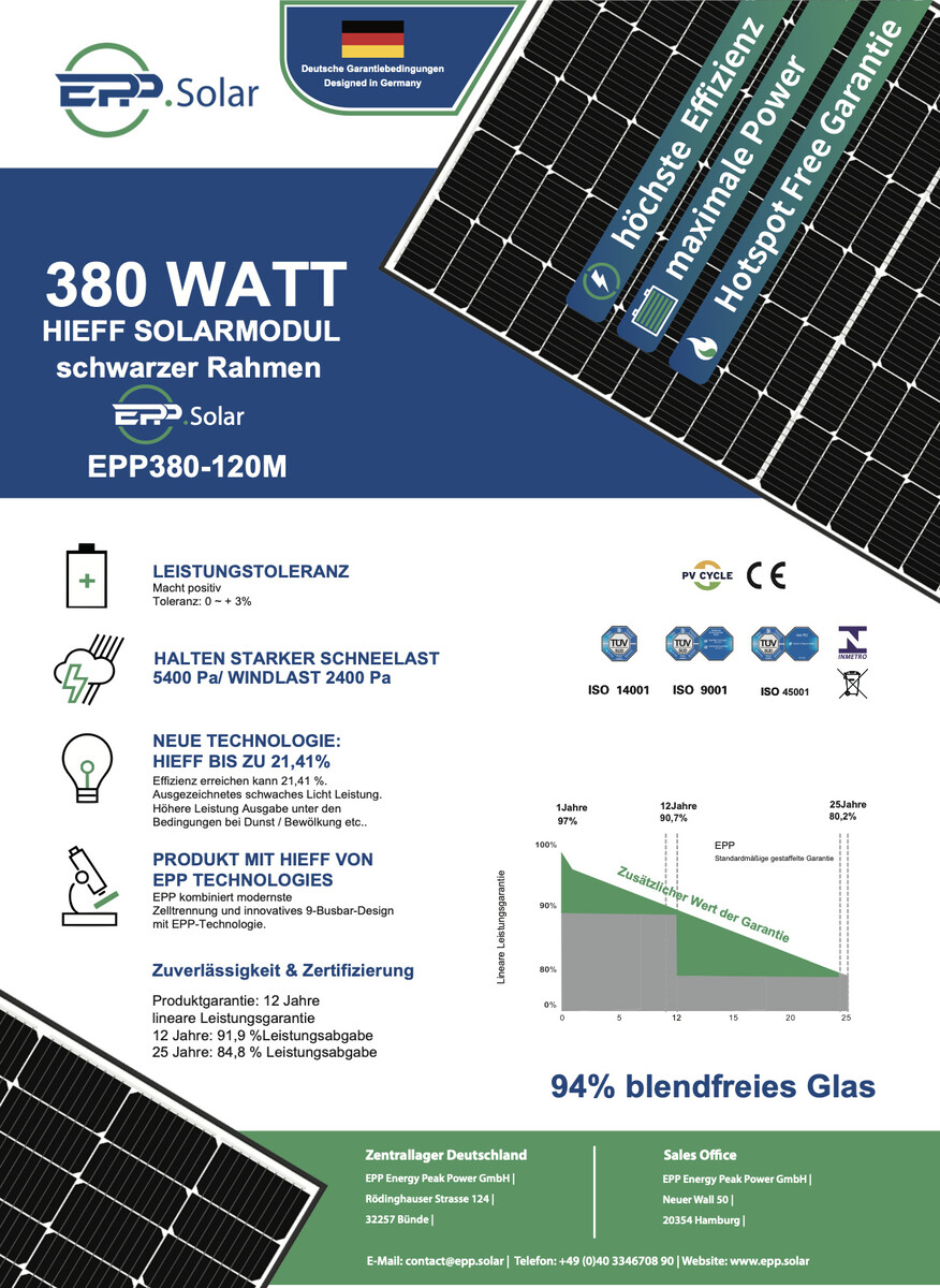 Das Balkonkraftwerk kommt mit zwei Solarmodulen von Hieff à 380 Wp mit einem Wirkungsgrad von 21,41 Prozent im stabilen, schwarzen Rahmen. Die monokristallinen Siliziumzellen sind mit einer ETFE-Folie überzogen, die sie vor Schmutz und Wasser schützt. Außerdem ist ein Hoymiles-Wechselrichter mit 600 Watt dabei, sowie ein 10 Meter langes Kabel mit Schukostecker, eine AC-Anschluss-Buchse, eine Verschlusskappe und zwei 5-Meter-Verlängerungskabel für Photovoltaik-Anlagen.