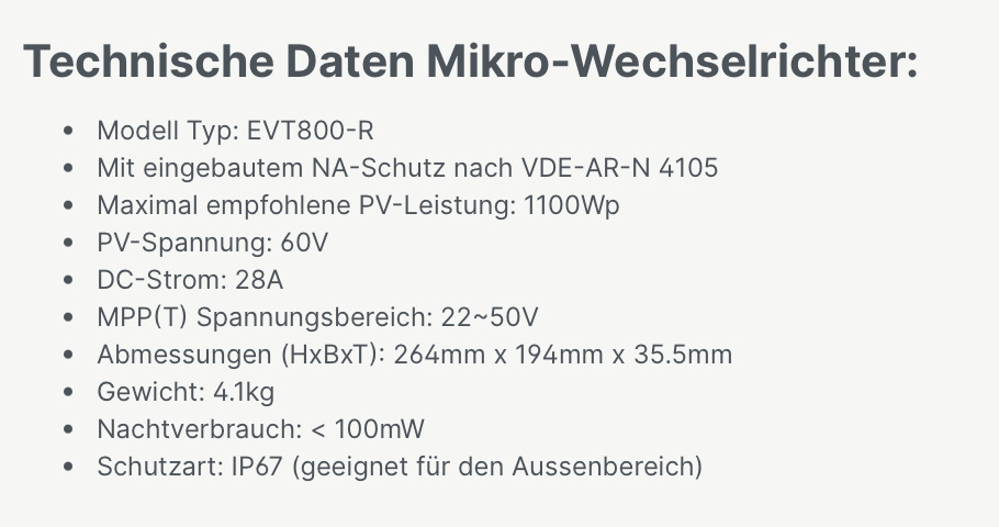 Zusätzlich wird das kleine Kraftwerk mit einem Mikro-Wechselrichter Envertech EVT-800-R inklusive Endkappe und einem Anschlusskabel BC05 3 x 1,5mm² AC 5m mit losem Schukostecker geliefert. Der EVT-800-R verfügt über einen integrierten NA-Schutz und eine empfohlene maximale PV-Leistung von 1100 Wp.