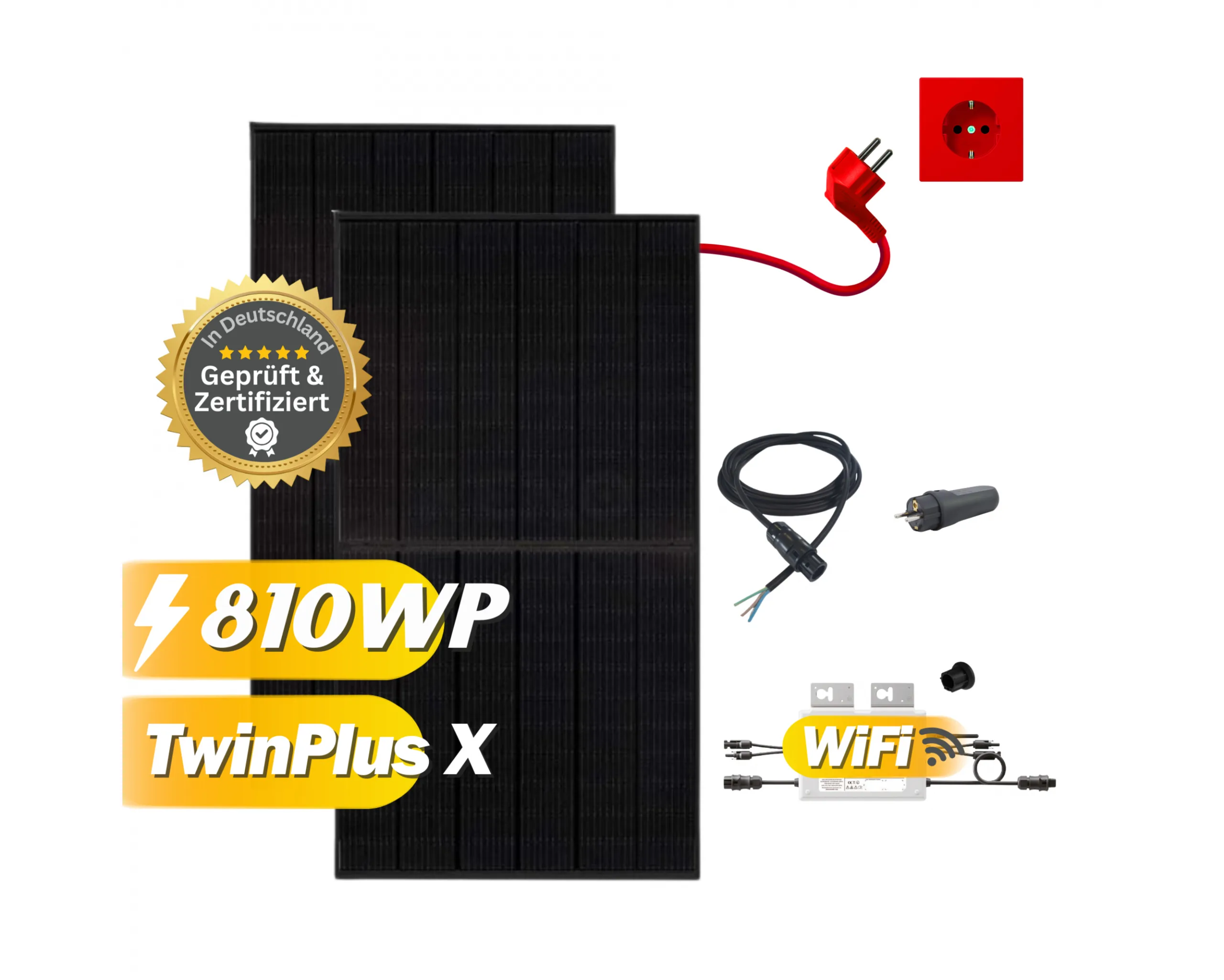 Im Set enthalten sind zwei Solarmodule PS405M6-18/VH von Phono Solar in Full Black mit jeweils 405 Wp. Die monokristallinen Module der TwinPlus-X-M6-Serie verfügen über 108 Zellen und sind mit Perc-Technologie ausgestattet, die etwas älter und weniger effizient ist als die modernere N-Typ-Technologie. Dafür haben die Solarmodule einen Wirkungsgrad von 21,25 % und einen sehr niedrigen Preis.
