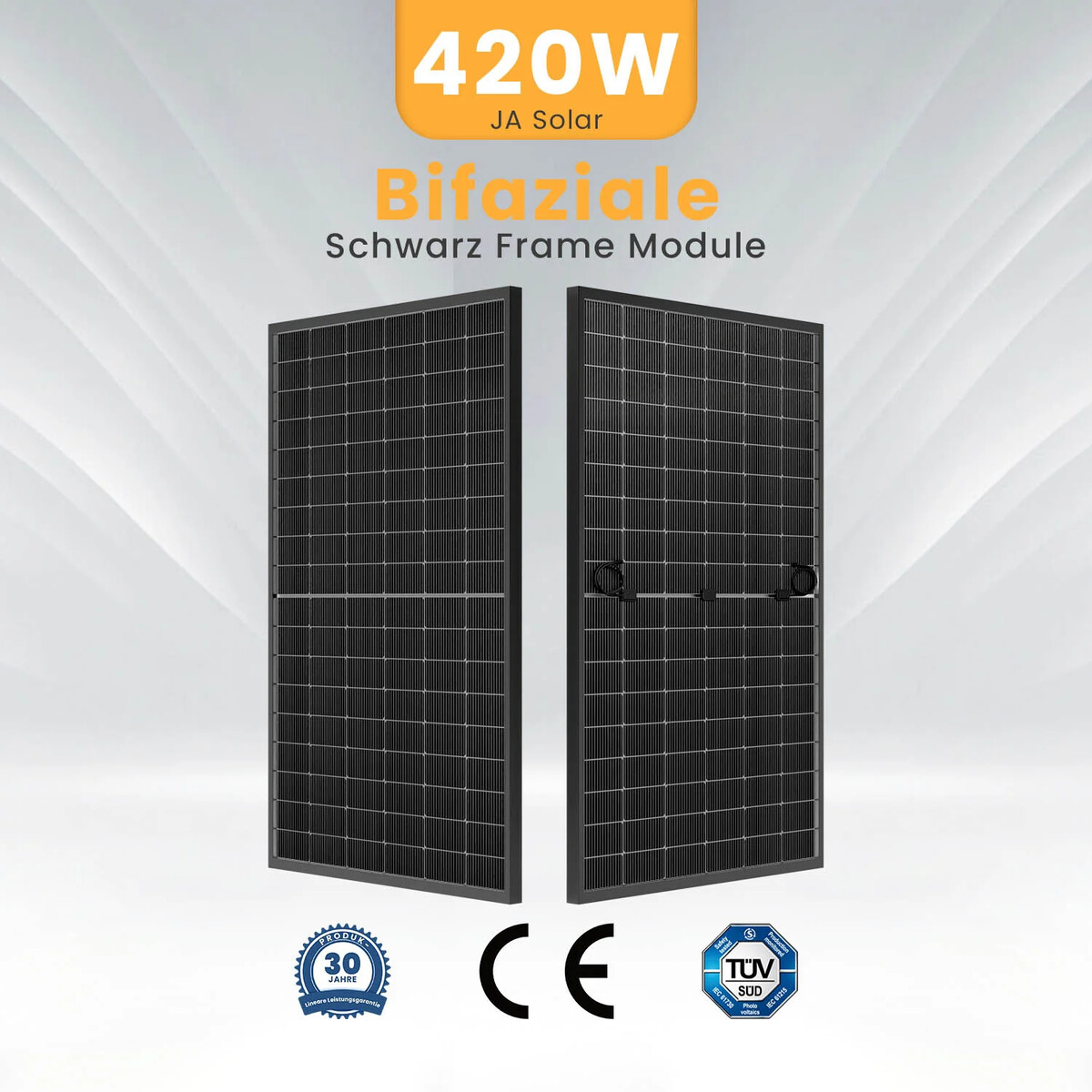 Das Balkonkraftwerk zur Erzeugung von Solarstrom besteht aus bifazialen Glas-Glas-Solarmodulen, die auch das auf die Rückseite des Moduls fallende Sonnenlicht in Solarstrom umwandeln. Außerdem bieten die Glasschichten den Solarzellen durch den speziellen Aufbau der Module einen guten Schutz vor Beschädigungen durch Umwelteinflüsse wie Hagel, Schnee und Wind, was zu einer längeren Lebensdauer führt.