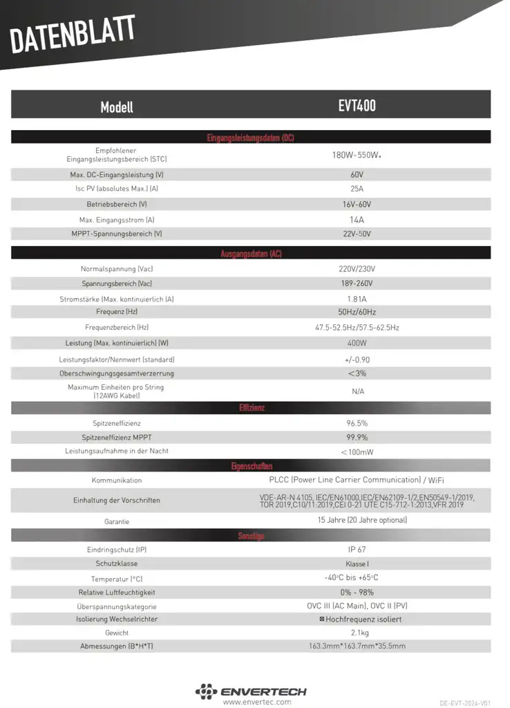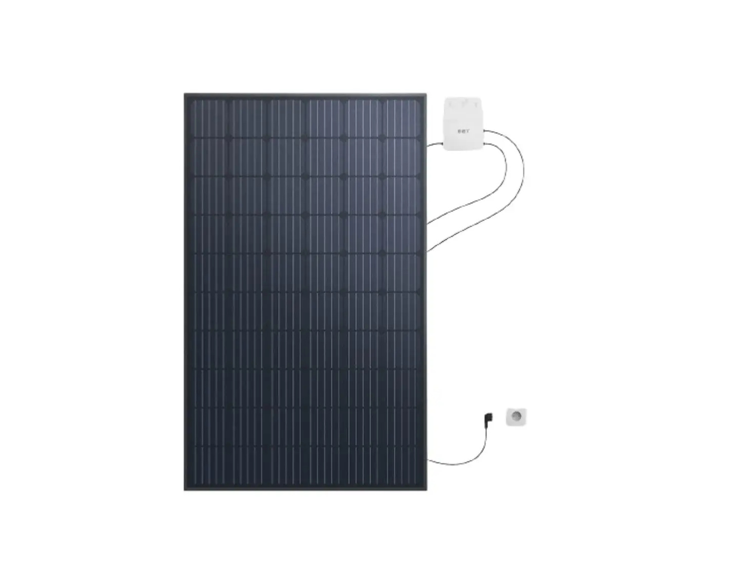 Zum Lieferumfang gehört ein Solarmodul LightMate Naked von EET Solar mit einer Leistung von 430 Wp, 120 Halbzellen und in der Farbe Full Black. Die Abmessungen betragen 1.722 x 1.134 x 30 mm bei einem Gewicht von 20 kg. Hinzu kommt ein Wechselrichter Envertech EVT400 für den Anschluss an die Steckdose mit einer Anschlussleistung von 400 Watt. Ein fünf Meter langes Schuko-Stromkabel ist ebenfalls enthalten.