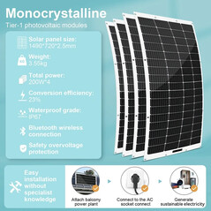 Das LANPWR 800W Balkonkraftwerk kommt mit vier flexiblen Solarpanels im Lieferumfang, die jeweils eine Leistung von 200 W aufweisen. Dank ihrer flexblen Bauweise lassen sich die nach IP67 geschützten Solarmodule besonders vielseitig montieren, z. B. auch auf runden Schuppendächern oder an abgerundeten Balkongeländern. Die Panels messen jeweils 149 x 82 cm und wiegen nur gut 3,5 kg, was die Installation ebefalls erleichtert.