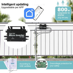 Zum Lieferumfang zählt zudem der Mikroinverter GT-800. Der Wechselrichter weist eine Effizienz von über 92 Prozent auf und kann bis zu 800 W ins Hausnetz einspeisen, was allerdings nicht den aktuellen deutschen Regularien entspricht. Die Stromerzeugung bzw. Eispeisung lässt sich dank Wi-Fi-Verbindung via Smartphone überwachen. Die Installation kann ohne Elektriker erfolgen. Das erforderliche Zubehör ist im Lieferumfang enthalten.